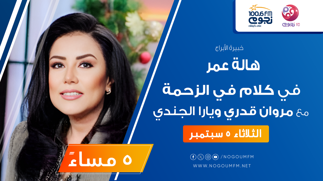 يستضيف مروان قدري ويارا الجندي، يوم الثلاثاء، 5 سبتمبر، خبيرة الأبراج هالة عمر، عبر برنامج «كلام في الزحمة»، على «نجوم إف إم»، من الساعة 5 إلى 7 مساءً.