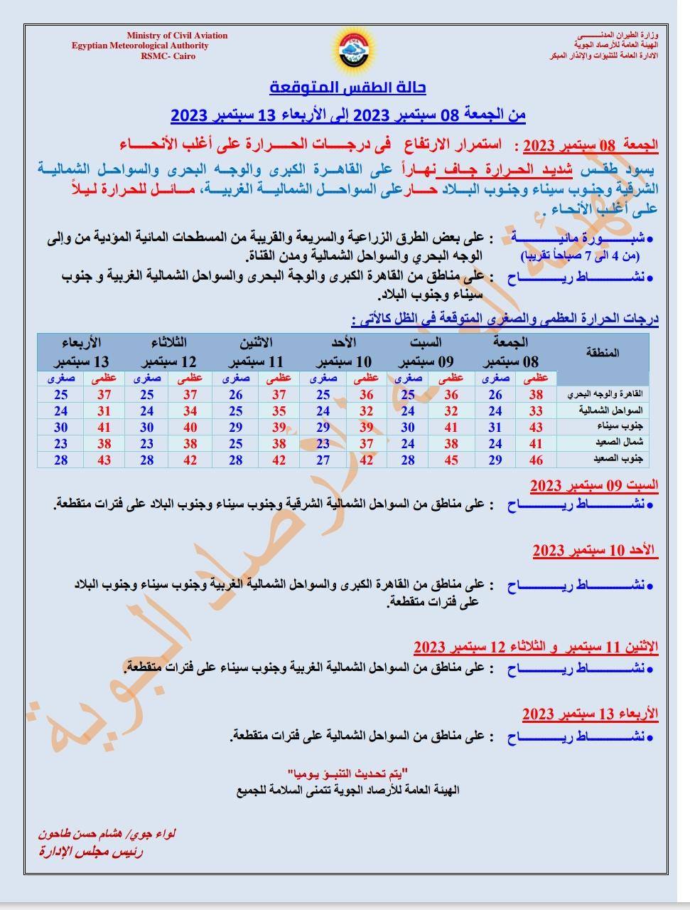 كما كشفت الهيئة عن توقعات الطقس ودرجات الحرارة خلال الأيام المقبلة وحتى يوم الأربعاء وجاءت كالتالي: