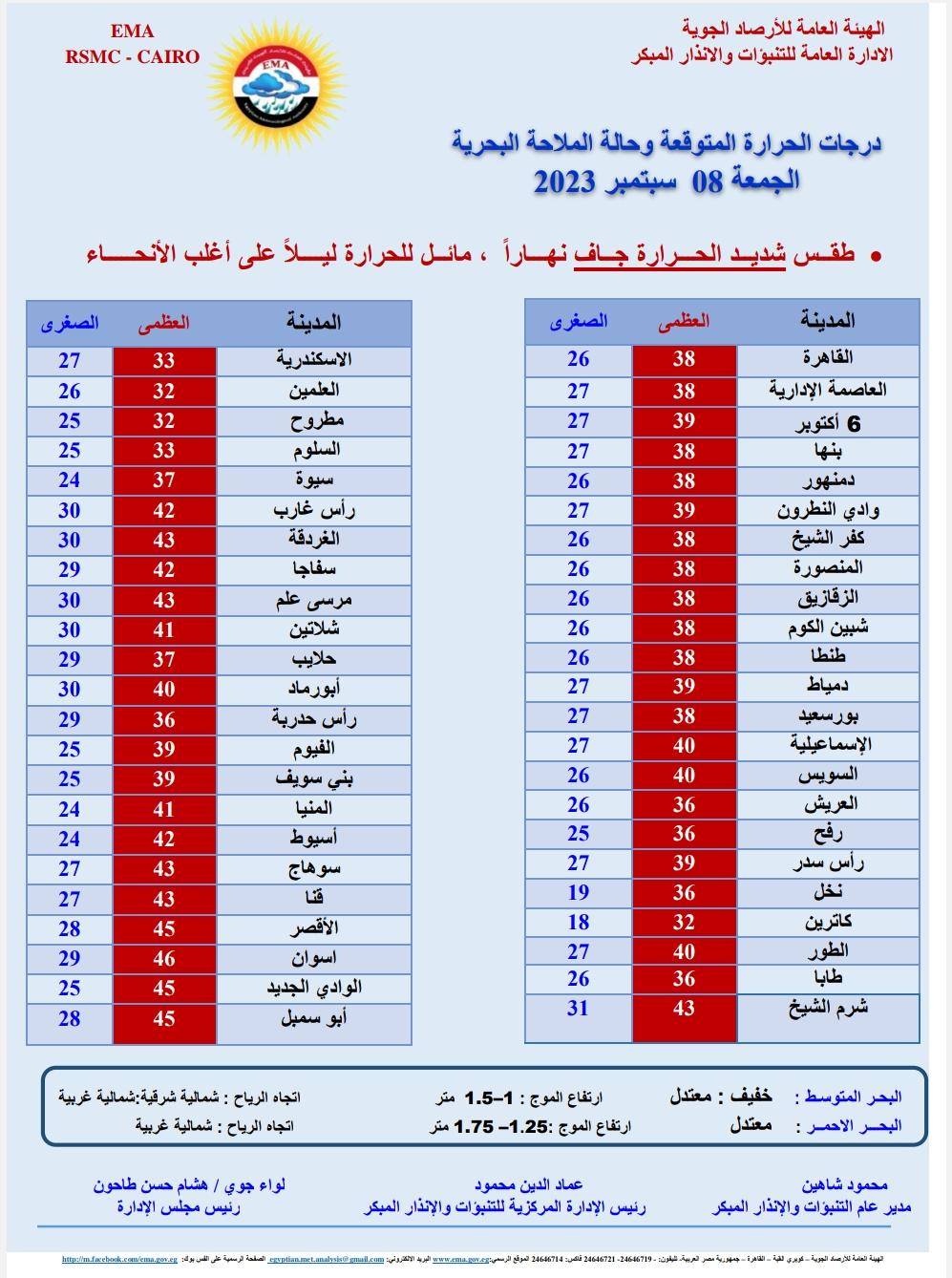 وقالت الهيئة إن غد الجمعة يشهد طقس شديد الحرارة جاف نهاراً على القاهرة الكبرى والوجه البحري والسواحل الشمالية الشرقية وجنوب سيناء وجنوب البلاد، حار على السواحل الشمالية الغربية، مائل للحرارة ليلاً على اغلب الأنحاء.