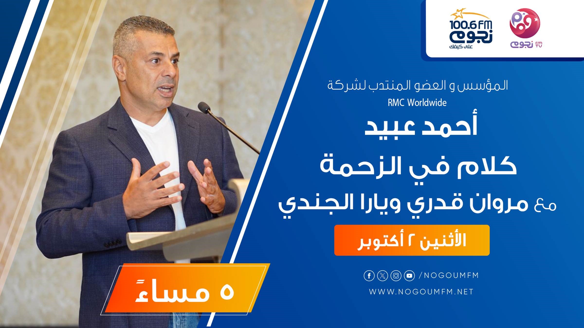 يستضيف مروان قدري ويارا الجندي، يوم الإثنين 2 أكتوبر، أحمد عبيد المؤسس والعضو المنتدب لشركة RMC Worldwide، عبر برنامج «كلام في الزحمة» على «نجوم إف إم»، من الساعة 5 إلى 7 مساءً.
