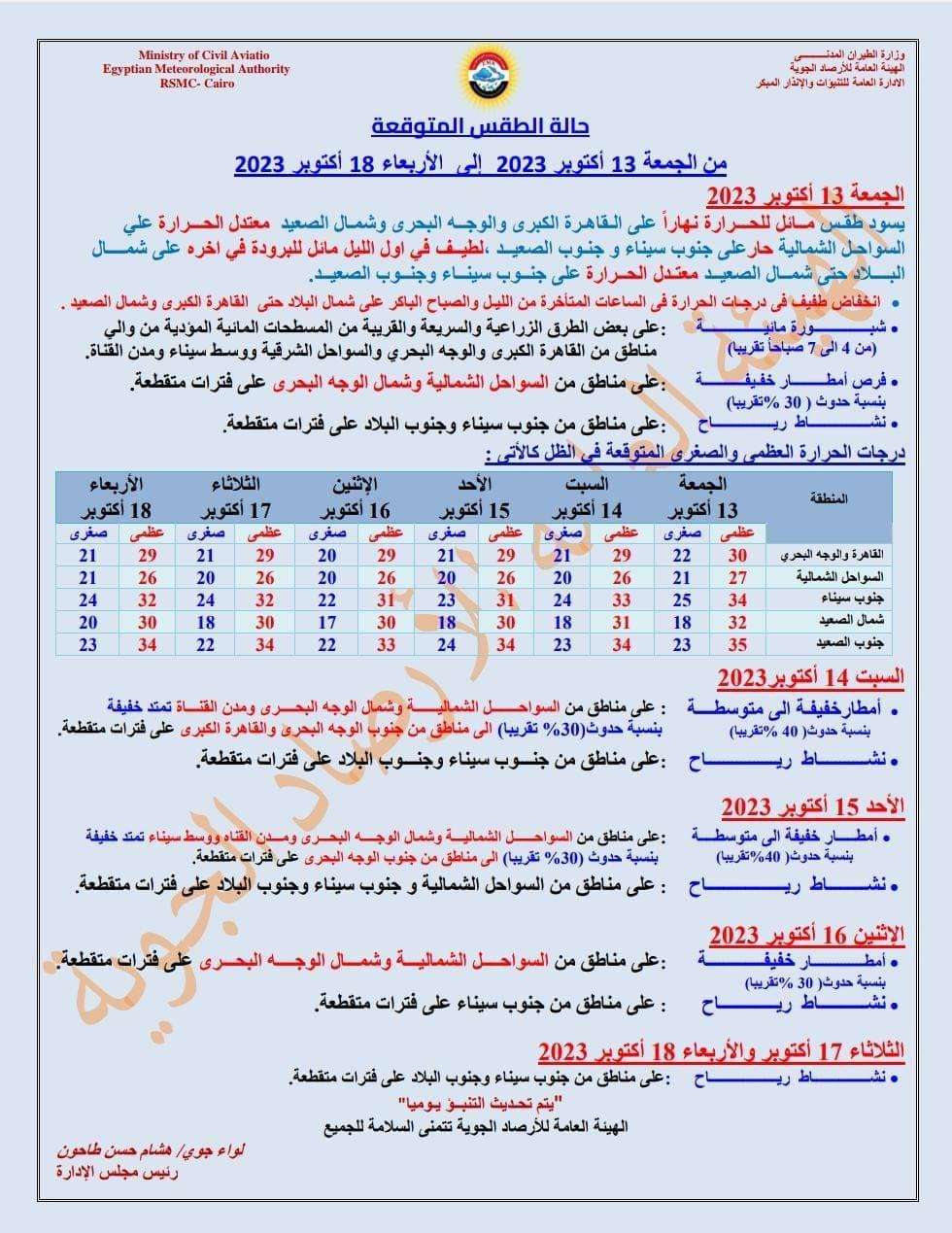 كما تسقط أمطار متوسطة يوم السبت 14 أكتوبر، على مناطق من السواحل الشمالية وشمال الوجه البحري ومدن القناة تمتد خفيفة بنسبة حدوث (30% تقريبا) إلى مناطق من جنوب الوجه البحري والقاهرة الكبرى على فترات متقطعة.