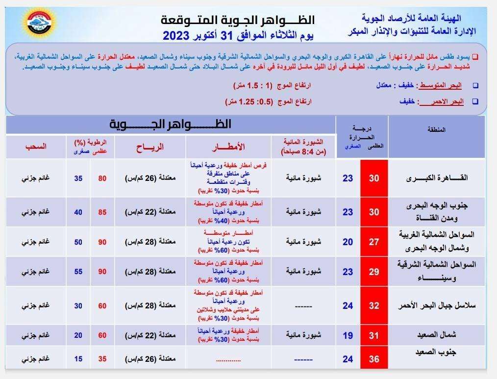 كشفت الهيئة العامة للأرصاد الجوية، عن توقعاتها لطقس، غدا الثلاثاء، الموافق 31 أكتوبر 2023.