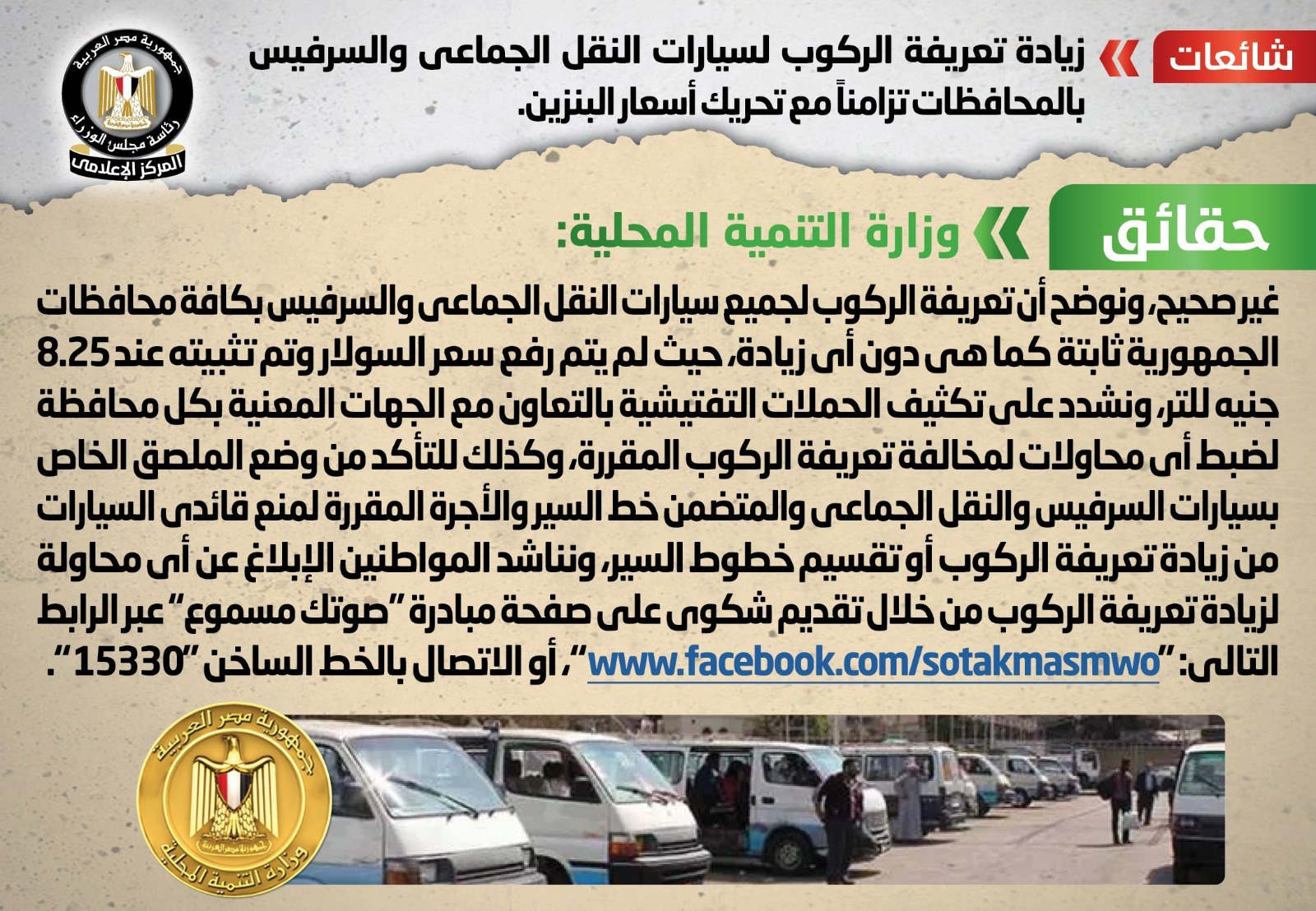 وقد قام المركز الإعلامي لمجلس الوزراء بالتواصل مع وزارة التنمية المحلية، والتي نفت تلك الأنباء، مُؤكدةً أنه لا صحة لزيادة تعريفة الركوب لسيارات النقل الجماعي والسرفيس بالمحافظات تزامناً مع تحريك أسعار البنزين، مُوضحةً أن تعريفة الركوب لجميع سيارات النقل الجماعي والسرفيس بكافة محافظات الجمهورية ثابتة كما هي دون أي زيادة، حيث لم يتم رفع سعر السولار وتم تثبيته عند 8.25 جنيه للتر، مُشددةً على تكثيف الحملات التفتيشية بالتعاون مع الجهات المعنية بكل محافظة لضبط أي محاولات لمخالفة تعريفة الركوب المقررة، وكذلك للتأكد من وضع الملصق الخاص بسيارات السرفيس والنقل الجماعي والمتضمن خط السير والأجرة المقررة لمنع قائدي السيارات من زيادة تعريفة الركوب أو تقسيم خطوط السير، مُناشدةً المواطنين الإبلاغ عن أي محاولة لزيادة تعريفة الركوب من خلال تقديم شكوى على صفحة مبادرة “صوتك مسموع” عبر الرابط التالي: “www.facebook.com/sotakmasmwo”، أو الاتصال بالخط الساخن “15330”.