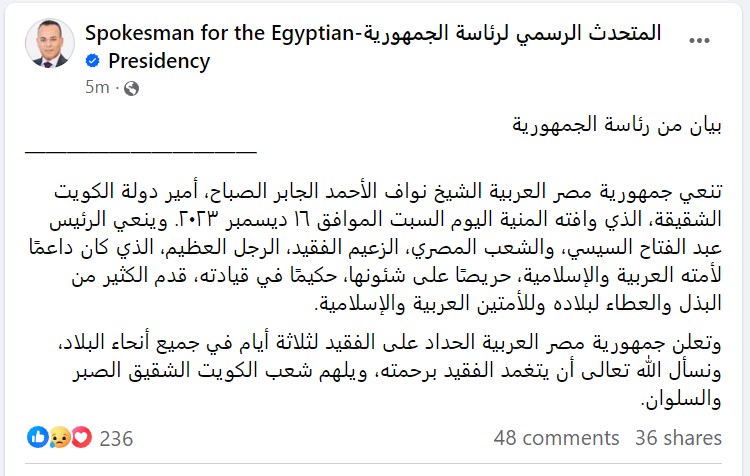 نعت جمهورية مصر العربية الشيخ نواف الأحمد الجابر الصباح، أمير دولة الكويت الشقيقة، الذي وافته المنية اليوم السبت الموافق 16 ديسمبر 2023.