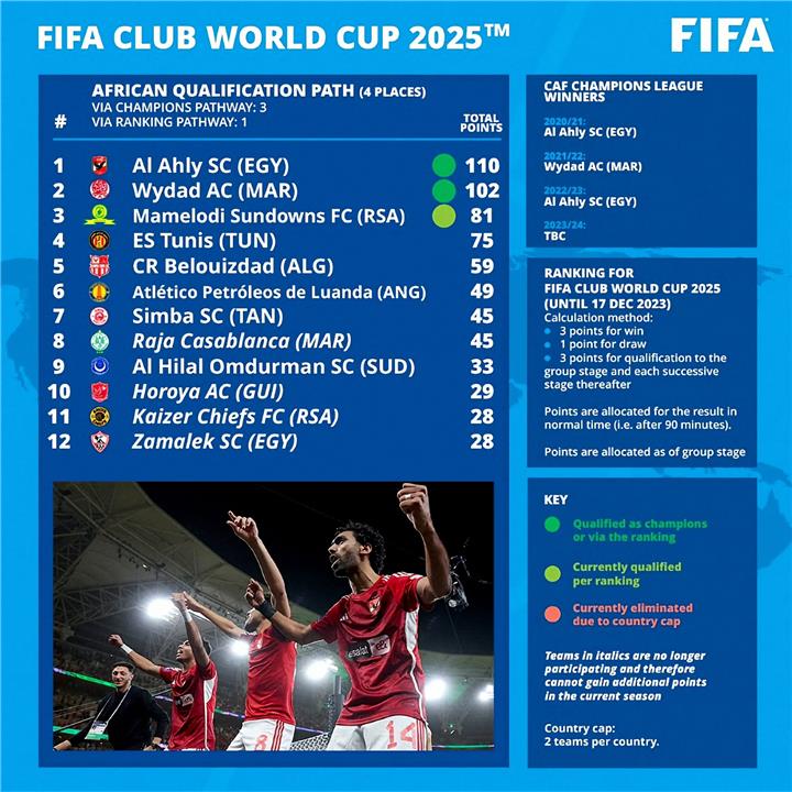 وتأهل كل من الأهلي والوداد بشكل رسمي، في انتظار فريقين، بجانب صن داونز الذي يحتل المركز الثالث في التصنيف الذي أعلنه الاتحاد الدولي.