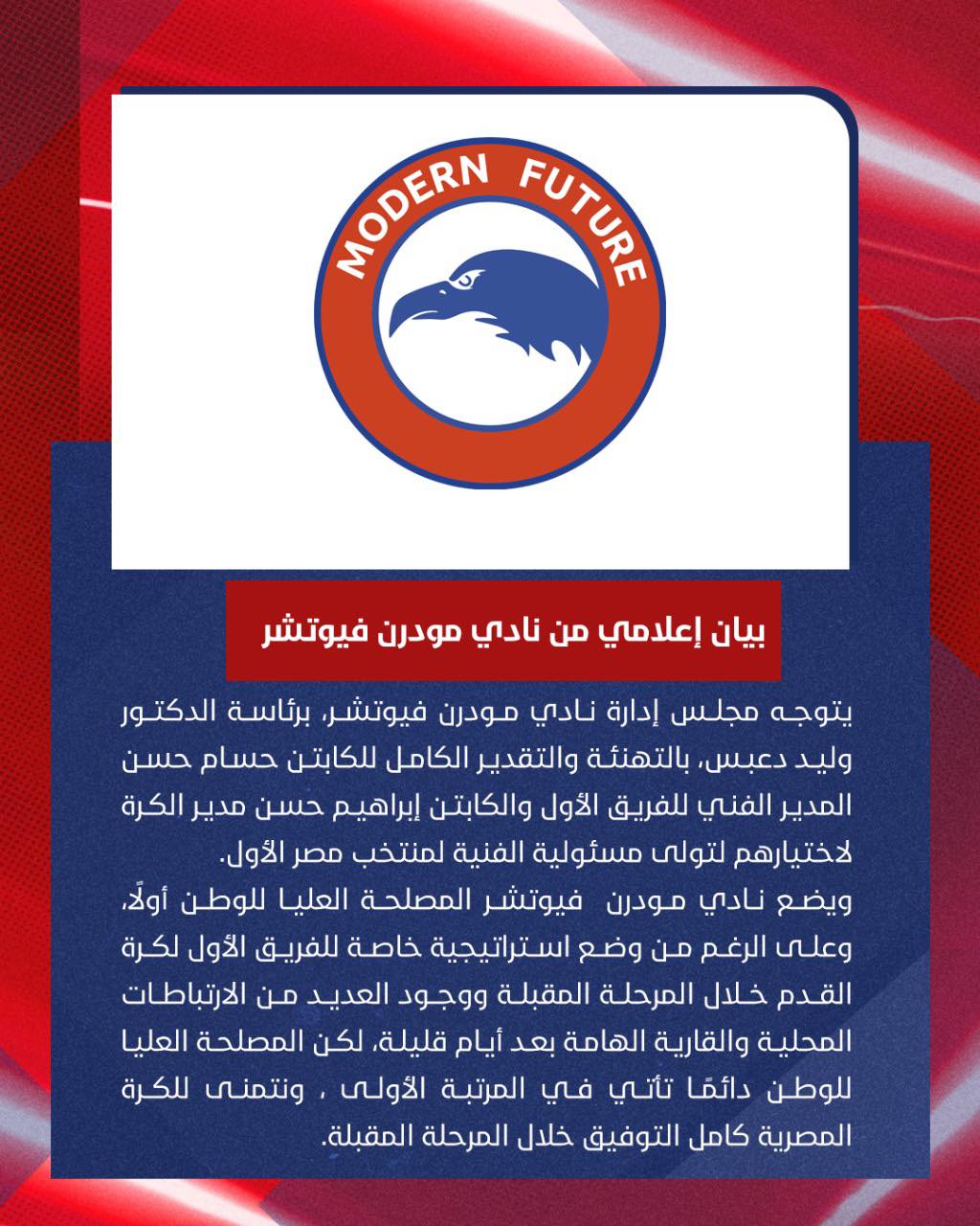 توجه مجلس إدارة نادي مودرن فيوتشر، بالتهنئة والتقدير الكامل لـ حسام حسن المدير الفني للفريق الأول وإبراهيم حسن مدير الكرة لاختيارهم لتولى مسؤولية الفنية لمنتخب مصر الأول.