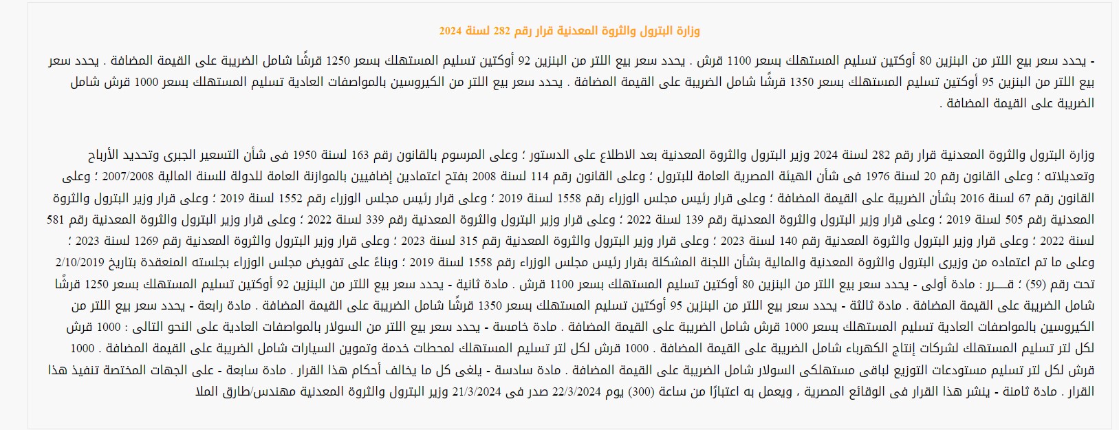 وأضاف البيان: “وزارة البترول والثروة المعدنية قرار رقم 282 لسنة 2024 وزير البترول والثروة المعدنية بعد الاطلاع على الدستور ؛ وعلى المرسوم بالقانون رقم 163 لسنة 1950 فى شأن التسعير الجبرى وتحديد الأرباح وتعديلاته ؛ وعلى القانون رقم 20 لسنة 1976 فى شأن الهيئة المصرية العامة للبترول ؛ وعلى القانون رقم 114 لسنة 2008 بفتح اعتمادين إضافيين بالموازنة العامة للدولة للسنة المالية 2007/2008 ؛ وعلى القانون رقم 67 لسنة 2016 بشأن الضريبة على القيمة المضافة ؛ وعلى قرار رئيس مجلس الوزراء رقم 1558 لسنة 2019؛ وعلى قرار رئيس مجلس الوزراء رقم 1552 لسنة 2019؛ وعلى قرار وزير البترول والثروة المعدنية رقم 505 لسنة 2019؛ وعلى قرار وزير البترول والثروة المعدنية رقم 139 لسنة 2022؛ وعلى قرار وزير البترول والثروة المعدنية رقم 339 لسنة 2022؛ وعلى قرار وزير البترول والثروة المعدنية رقم 581 لسنة 2022 ؛ وعلى قرار وزير البترول والثروة المعدنية رقم 140 لسنة 2023 ؛ وعلى قرار وزير البترول والثروة المعدنية رقم 315 لسنة 2023 ؛ وعلى قرار وزير البترول والثروة المعدنية رقم 1269 لسنة 2023 ؛ وعلى ما تم اعتماده من وزيرى البترول والثروة المعدنية والمالية بشأن اللجنة المشكلة بقرار رئيس مجلس الوزراء رقم 1558 لسنة 2019 ؛ وبناءً على تفويض مجلس الوزراء بجلسته المنعقدة بتاريخ 2/10/2019 تحت رقم (59)؛ قــــــرر: مادة أولى – يحدد سعر بيع اللتر من البنزين 80 أوكتين تسليم المستهلك بسعر 1100 قرش، مادة ثانية، يحدد سعر بيع اللتر من البنزين 92 أوكتين تسليم المستهلك بسعر 1250 قرشًا شامل الضريبة على القيمة المضافة، مادة ثالثة- يحدد سعر بيع اللتر من البنزين 95 أوكتين تسليم المستهلك بسعر 1350 قرشًا شامل الضريبة على القيمة المضافة . مادة رابعة – يحدد سعر بيع اللتر من الكيروسين بالمواصفات العادية تسليم المستهلك بسعر 1000 قرش شامل الضريبة على القيمة المضافة . مادة خامسة – يحدد سعر بيع اللتر من السولار بالمواصفات العادية على النحو التالى : 1000 قرش لكل لتر تسليم المستهلك لشركات إنتاج الكهرباء شامل الضريبة على القيمة المضافة . 1000 قرش لكل لتر تسليم المستهلك لمحطات خدمة وتموين السيارات شامل الضريبة على القيمة المضافة . 1000 قرش لكل لتر تسليم مستودعات التوزيع لباقى مستهلكى السولار شامل الضريبة على القيمة المضافة . مادة سادسة – يلغى كل ما يخالف أحكام هذا القرار . مادة سابعة – على الجهات المختصة تنفيذ هذا القرار . مادة ثامنة – ينشر هذا القرار فى الوقائع المصرية ، ويعمل به اعتبارًا من ساعة الثالثة فجر يوم 22/3/2024 صدر فى 21/3/2024”.