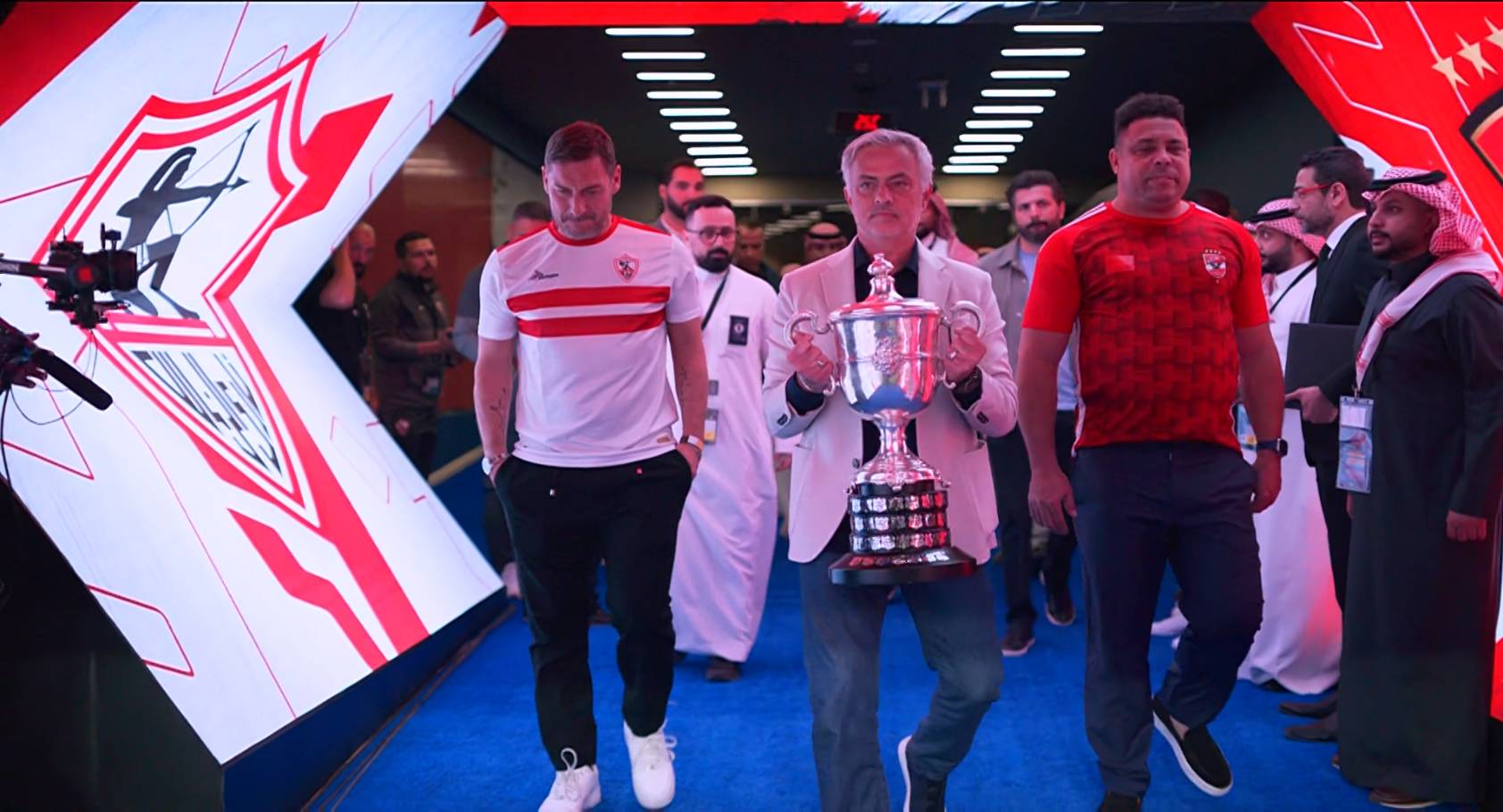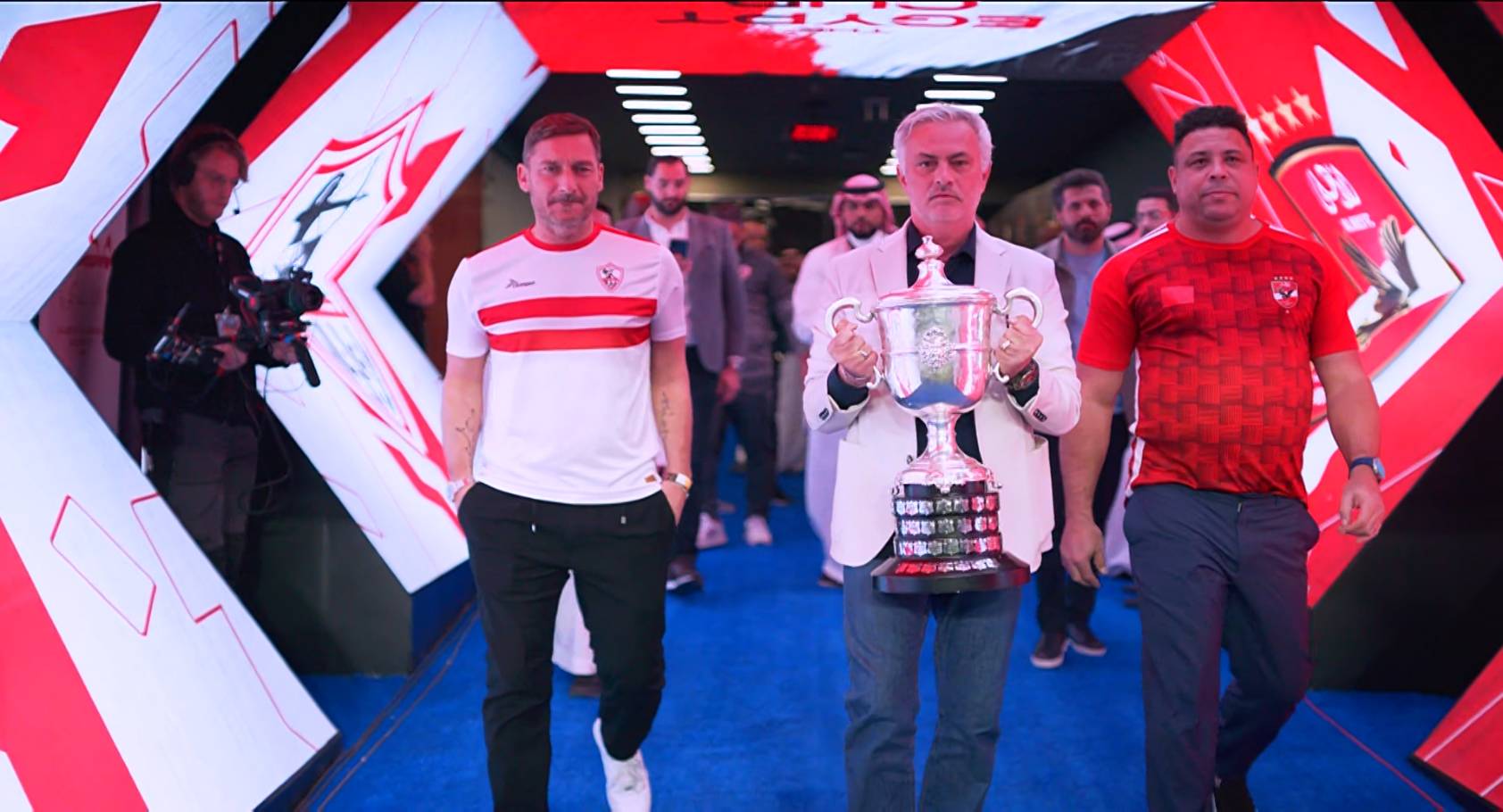 شهدت مباراة الأهلي والزمالك في نهائي كأس مصر قبل انطلاقها على ملعب “الأول بارك” في الرياض مشهدا رائعا بدخول المدرب البرتغالي جوزيه مورينيو حاملا الكأس، وتواجد بجوار الأسطورة الإيطالي توتي مرتديا قميص الزمالك، وأيضا الظاهرة البرازيلي رونالدو مرتديا قميص الأهلي.