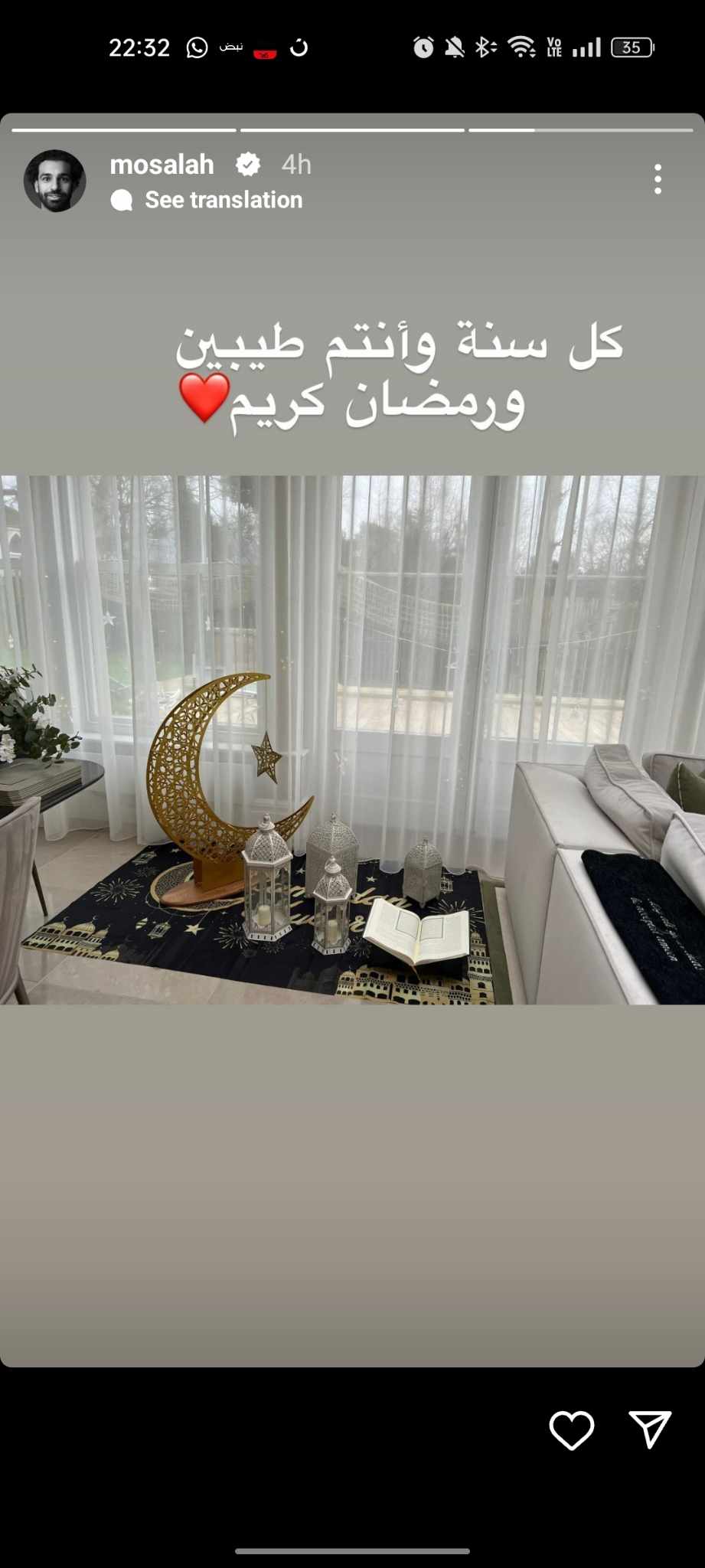 هنأ محمد صلاح، لاعب منتخب مصر وليفربول، الأمة الإسلامية بمناسبة حلول شهر رمضان المبارك.