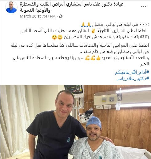 وكان الدكتور علاء ياسر استشاري أمراض القلب، قد نشر صورة رفقة الفنان محمد هنيدي وهو في المستشفى، قائلا: «في ليلة من ليالي رمضان اطمنا على الشرايين التاجية للفنان محمد هنيدي اللي أسعد الناس بتلقائيته وعفويته وعدم خدش حياء المصريين».