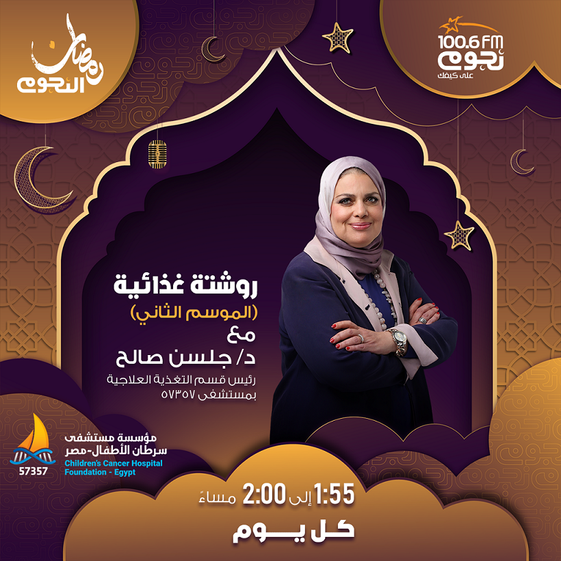 تقدمها الدكتورة جلسن صالح، أستاذ دكتور ورئيس قسم التغذية العلاجية بمستشفى 57357 وأستاذ الصحة العامة والتغذية العلاجية بالمعهد القومي للتغذية يوميًا من الساعة 1.55 حتى 2 ظهرًا.