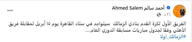 وكتب أحمد سالم المتحدث الرسمي لنادي الزمالك عبر صفحته الشخصية على “فيسبوك”: “الفريق الأول لكرة القدم بنادي الزمالك سيتواجد في استاد القاهرة يوم 15 أبريل لمقابلة فريق الأهلي وفقا لجدول مباريات مسابقة الدوري العام”.