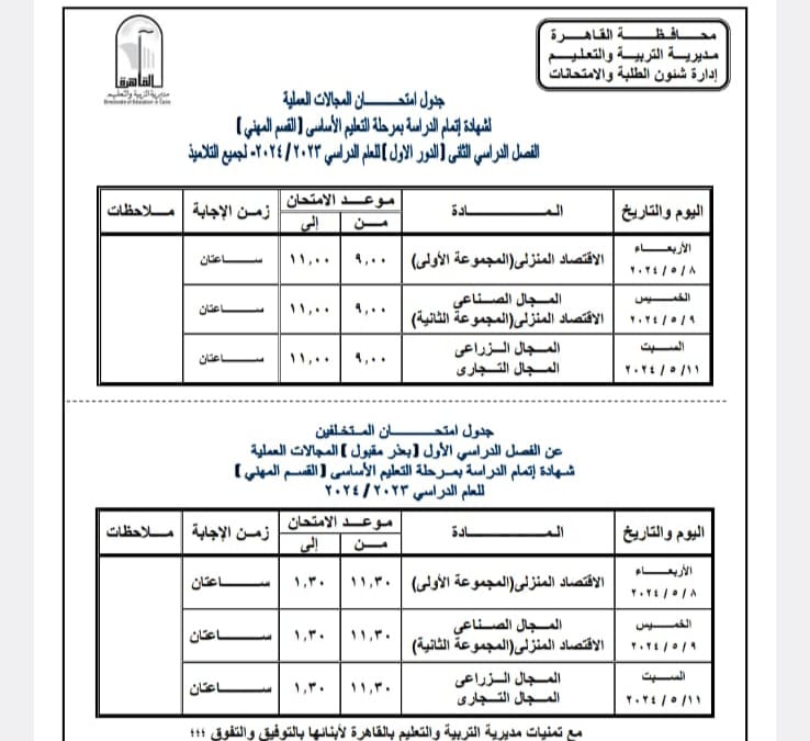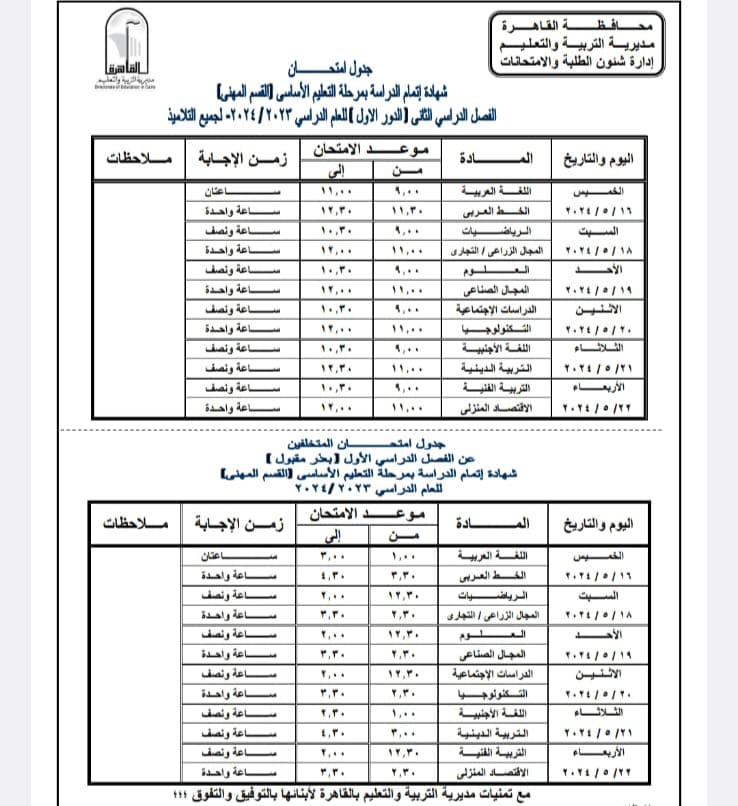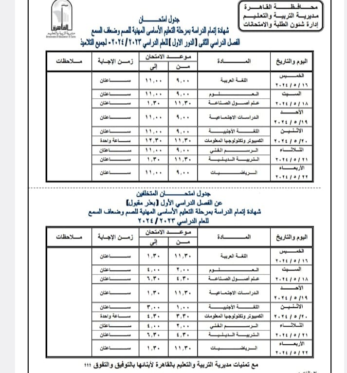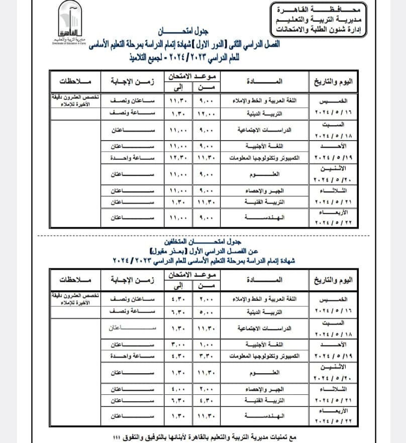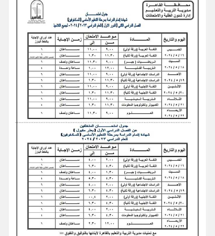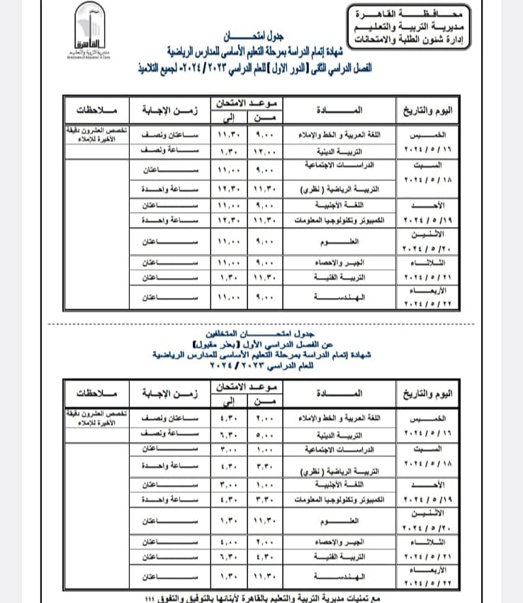 اعتمد اللواء خالد عبد العال محافظ القاهرة جدول امتحانات الفصل الدراسي الثانى للعام الدراسى ٢٠٢٣ – ٢٠٢٤ حيث تجرى الامتحانات خلال الفترة من ٨ مايو إلي ٢٣ مايو ٢٠٢٤ .