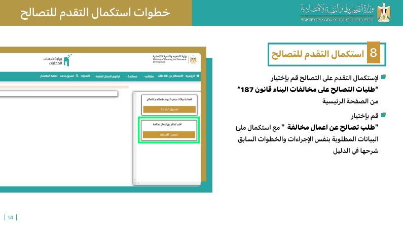 وأوضحت د. هالة السعيد، وزيرة التخطيط والتنمية الاقتصادية أن المنظومة الإلكترونية لطلبات التصالح عن مخالفات البناء لتقديم كافة الخدمات للمواطنين بشكل رقمي، بحيث يستطيع المواطن الحصول على الخدمة من خلال المنظومة الالكترونية القومية الخاصة بالمراكز التكنولوجية بالمراكز والمدن / الأحياء والوحدات القروية بمحافظات الجمهورية، أو من خلال البوابة الالكترونية للمحليات: http://Lgs.gov.eg
