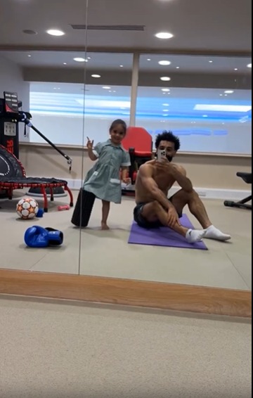 شارك الدولي المصري محمد صلاح، نجم ليفربول الإنجليزي، عبر حسابه على “إنستجرام” صورا طريفة مع ابنته “كيان” خلال تواجده في صالة الألعاب الرياضية بمنزله.