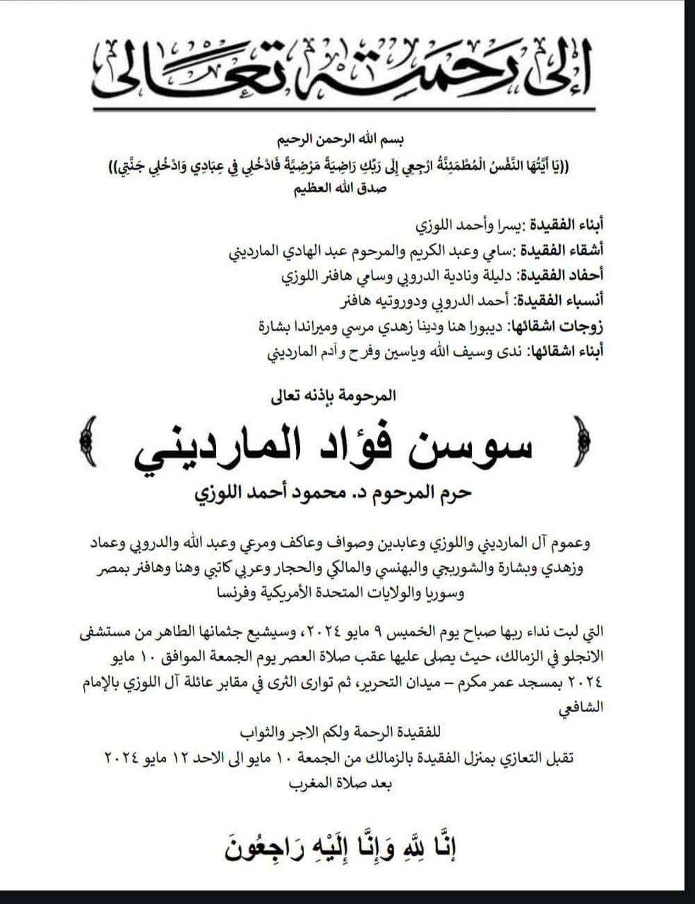 ونعى المخرج خيري بشارة، والدة الفنانة يسرا اللوزي عبر حسابه بموقع فيسبوك: «أبكي منذ سماعي ذلك الخبر شديد الحزن والصادم للغاية وأرفض تصديقه ارقدي في سلام أيتها السيدة الفاضلة النبيلة الملاك الأرضي الجميل سوسن مارديني».