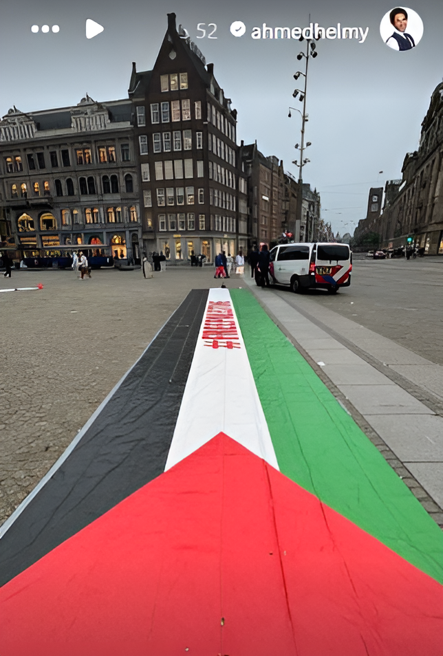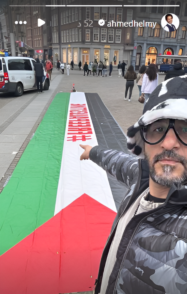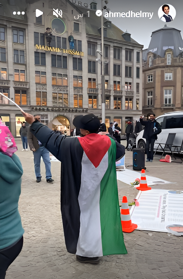 شارك الفنان أحمد حلمي في وقفة تضامنية مع الشعب الفلسطيني في شوارع العاصمة أمستردام بـ هولندا على هامش حضوره فعاليات مهرجان روتردام للفيلم العربي.