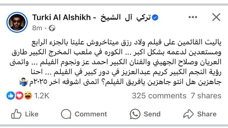 وكتب تركي آل الشيخ عبر صفحته بموقع “فيسبوك”: “ياليت القائمين على فيلم ولاد رزق ميتاخروش علينا بالجزء الرابع ومستعدين لدعمه بشكل أكبر.. الكرة في ملعب المخرج الكبير طارق العريان وصلاح الجهيني والفنان الكبير أحمد عز ونجوم الفيلم، وأتمنى رؤية النجم الكبير كريم عبدالعزيز في دور كبير في الفيلم، إحنا جاهزين هل أنتم جاهزين يا فريق الفيلم؟ أتمنى أشوفه أخر 2025”.