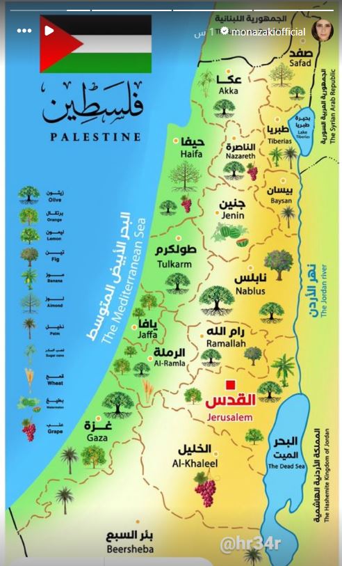 شاركت الفنانة منى زكي صورة للخريطة الأصلية لدولة فلسطين قبل الاحتلال بالأسماء التاريخية لمُدنها.