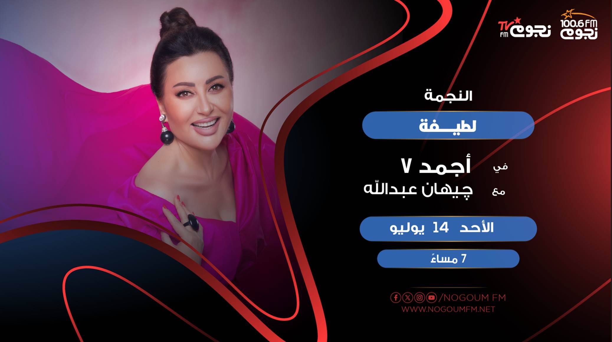 تستضيف جيهان عبد الله في حلقة الأحد 14 يوليو، من برنامج «أجمد 7» على «نجوم إف إم»، النجمة لطيفة في السابعة مساءً.