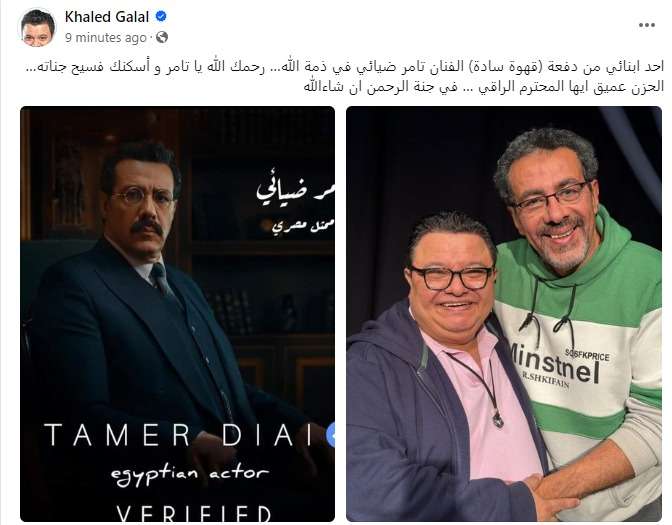 وكتب المخرج خالد جلال، عبر «فيسبوك»: «أحد أبنائي من دفعة (قهوة سادة) الفنان تامر ضيائي في ذمة الله.. رحمك الله يا تامر وأسكنك فسيح جناته، الحزن عميق أيها المحترم الراقي.. في جنة الرحمن إن شاء الله».