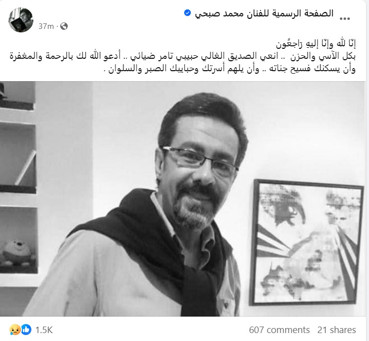 كما نعاه الفنان محمد صبحي عبر صفحته الرسمية على «فيسبوك»، معلقا: «إنّا لله وإنّا إليهِ رَاجعُون بكل الآسي والحزن.. أنعي الصديق الغالي حبيبي تامر ضيائي.. أدعو الله لك بالرحمة والمغفرة وأن يسكنك فسيح جناته.. وأن يلهم أسرتك وحبايبك الصبر والسلوان».