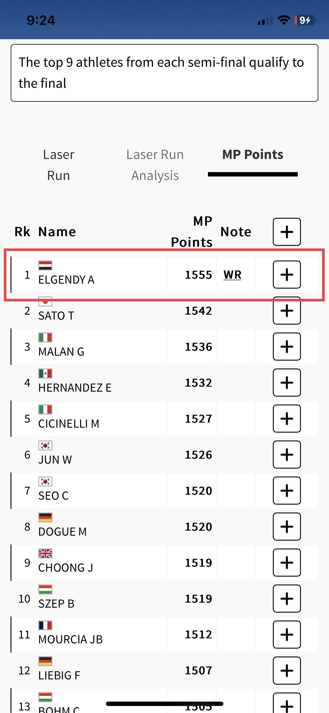 واختتم الجندي منافسات النهائي في المركز الأول برصيد 1555 كرقم أولمبي قياسي عالمي جديد للبطل المصري.