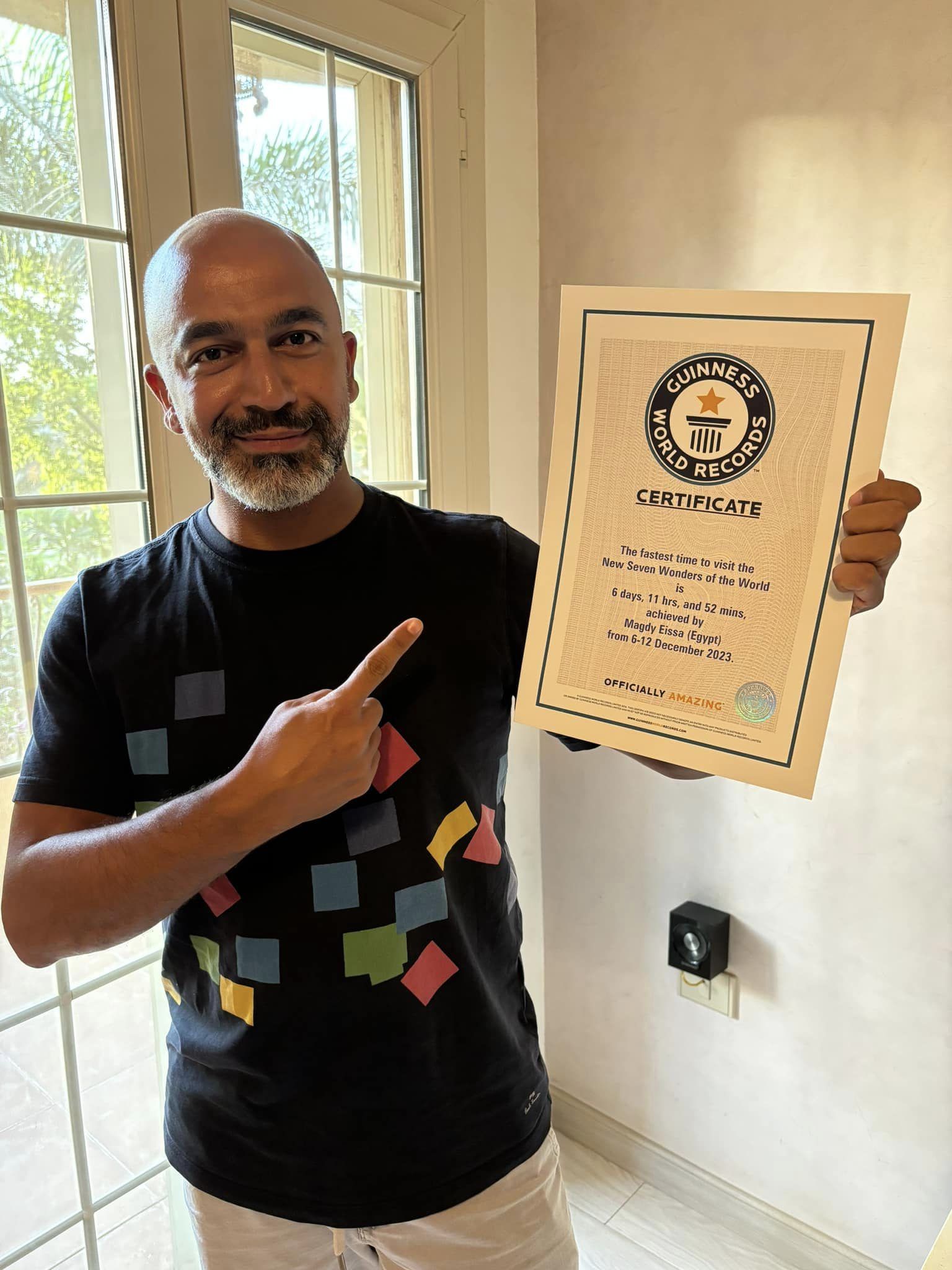 الرقم الأول كان من نصيب المغامر المصري مجدي عيسى حيث أعلنت موسوعة جينيس للأرقام القياسية أن مجدي عيسى، صاحب الـ 45 عام، حقق لقب أسرع وقت لزيارة عجائب الدنيا السبع الجديدة، وذلك خلال 6 أيام و11 ساعة و52 دقيقة، أي أنه كان أسرع بأربع ساعات ونصف من صاحب الرقم القياسي السابق والذي سجله الإنجليزي جيمي ماكدونالد خلال العام الماضي.