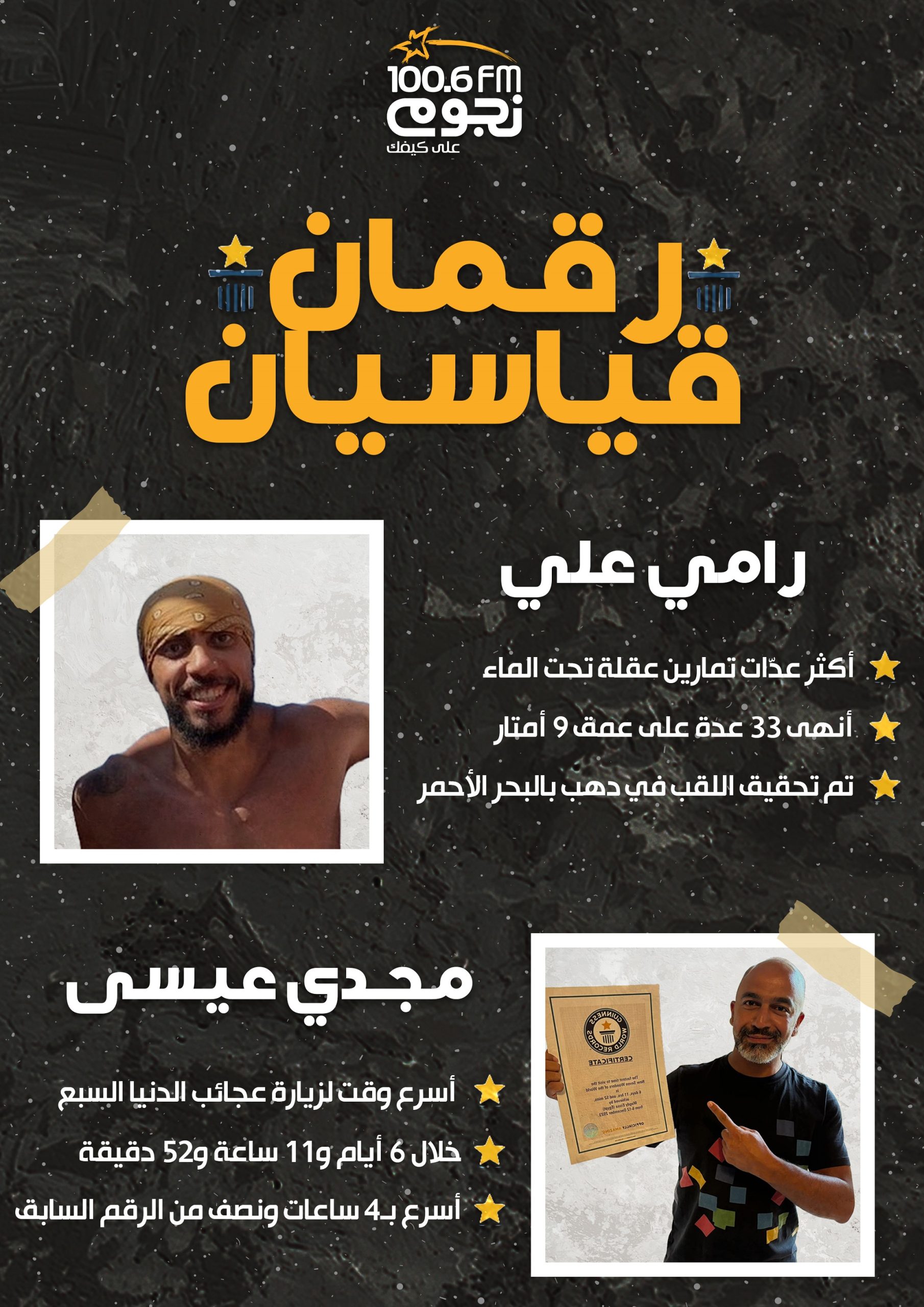 حقّق مغامران مصريّان رقمين قياسيين جديدين ضمن موسوعة جينيس للأرقام القياسية وتم الإعلان عن الرقمين خلال الشهر الماضي تباعًا.
