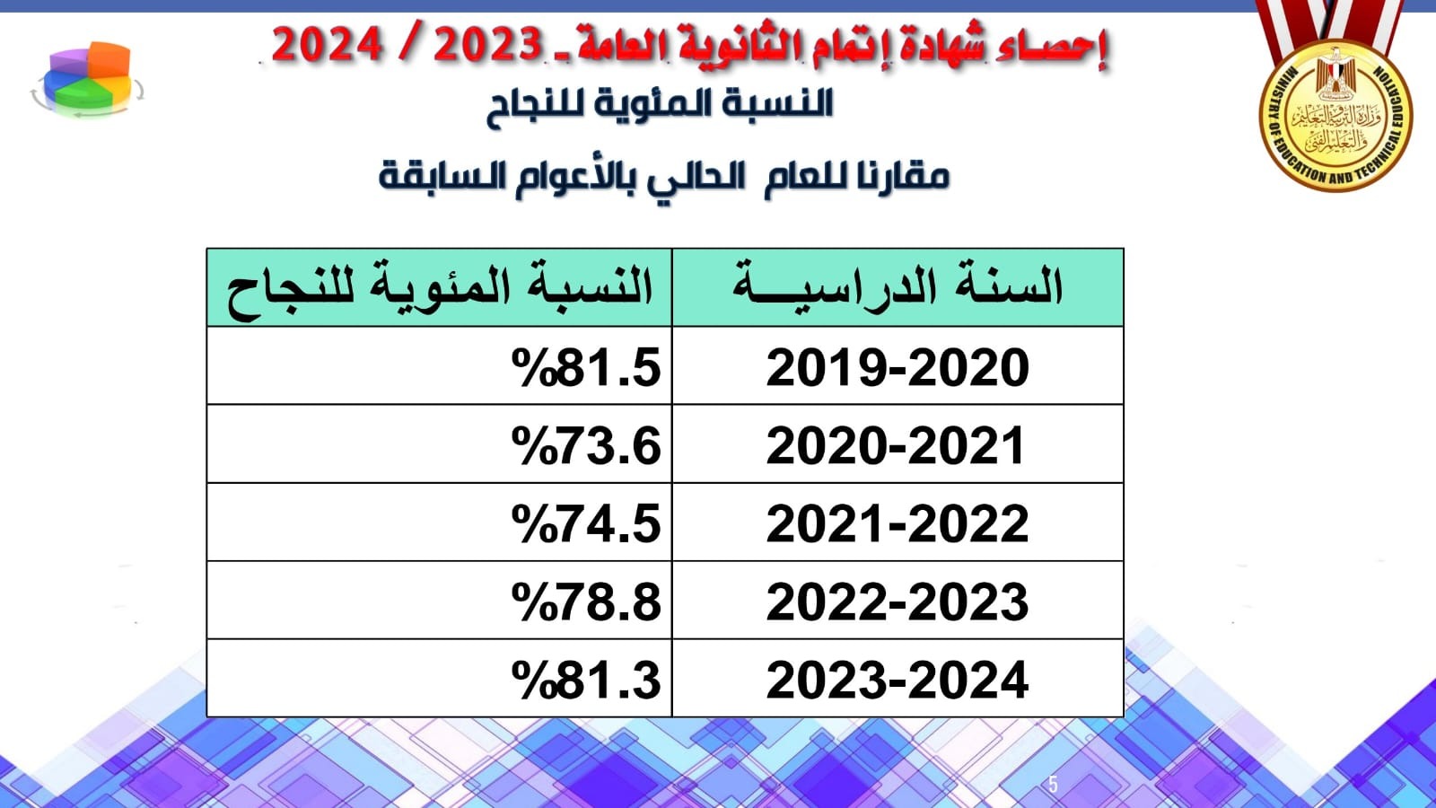 وارتفعت نسبة النجاح العامة في الثانوية العامة 2024 والتي بلغت 81.3%، عن نسبة النجاح في عام 2023 والتي بلغت 78.81%، بزيادة أكثر من 2.49% عن العام الماضي.