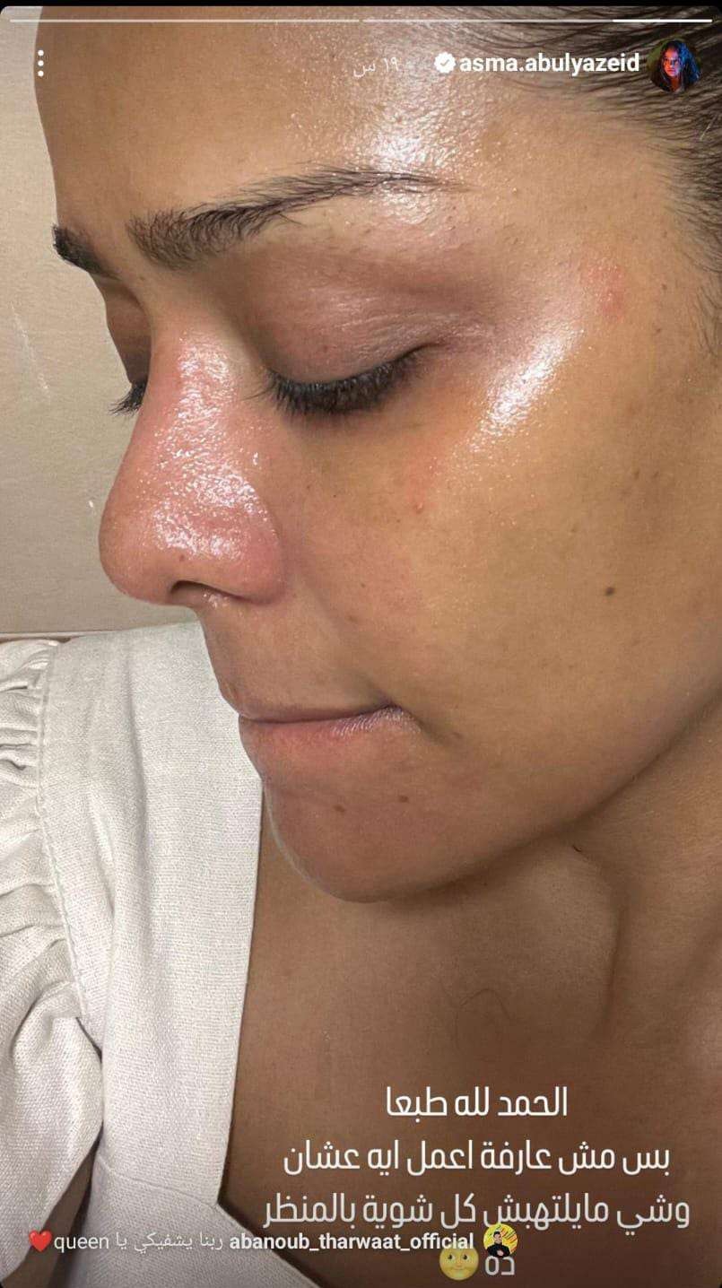 حرصت الفنانة أسماء أبو اليزيد على طمأنة جمهورها بشأن حالة وجهها، وذلك بعدما نشرت صورة عبر حسابها على منصة «إنستجرام» تكشف عن إصابتها وتعرض بشرتها للالتهابات.