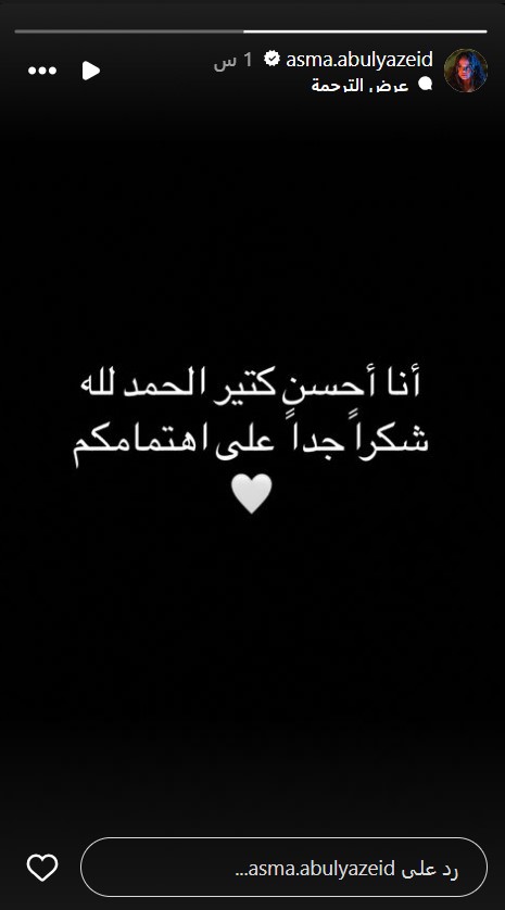 ونشرت أسماء أبو اليزيد، اليوم الاثنين، من خلال خاصية «ستوري» عبر حسابها الرسمي على موقع التواصل الاجتماعي وتبادل الصور والفيديوهات «إنستجرام»، وكتبت: «أنا أحسن الحمد لله، شكرًا جدًا على اهتمامكم».