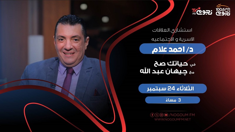 تستضيف جيهان عبد الله عبر برنامج «حياتك صح» على «نجوم إف إم»، الثلاثاء 24 سبتمبر، الدكتور أحمد علام، استشاري العلاقات الأسرية والاجتماعية.