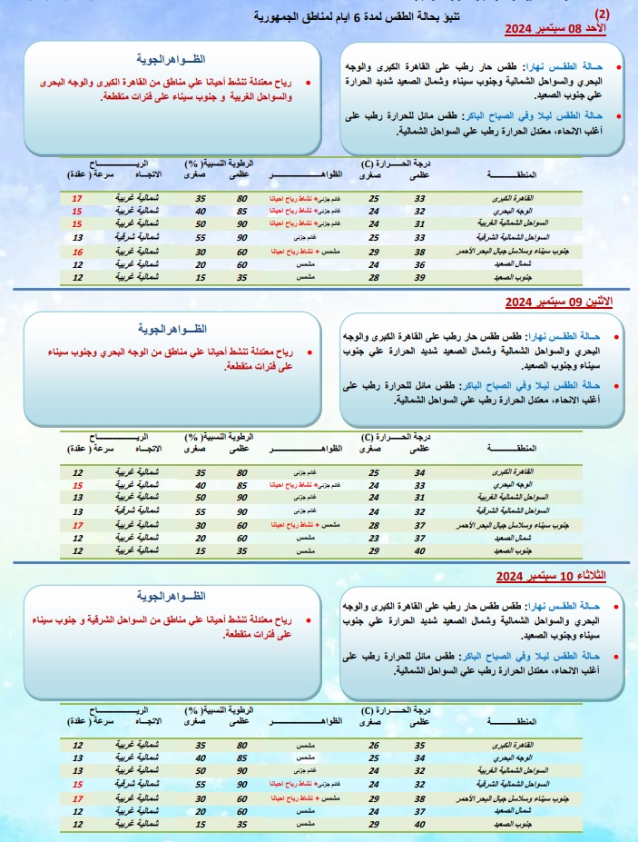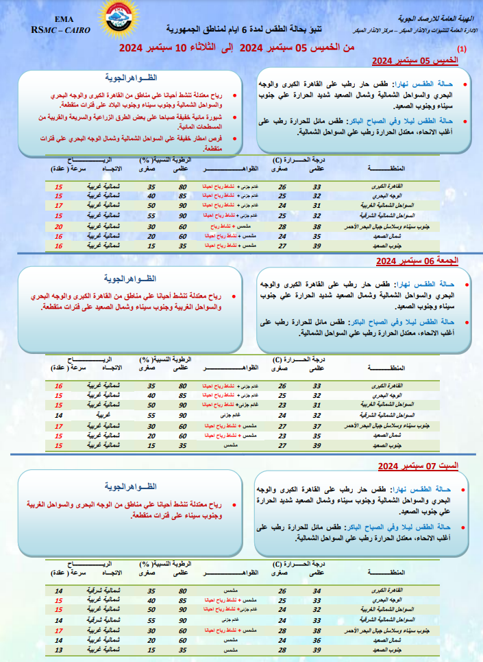 أعلنت هيئة الأرصاد الجوية إنه يسود خلال الأيام القادمة، طقس حار رطب نهارًا على أغلب الأنحاء، شديد الحرارة على جنوب سيناء وجنوب الصعيد، مائل للحرارة رطب ليلًا.