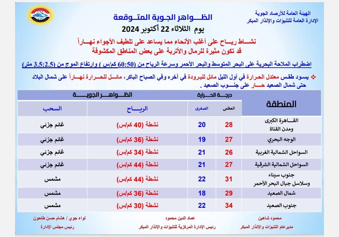 ووفقا للهيئة، فإن نشاط الرياح يساعد على تلطيف الأجواء نهارًا، إذ تكون مثيرة للرمال والأتربة على بعض المناطق المكشوفة واضطراب الملاحة البحرية على البحر المتوسط والبحر الأحمر وسرعة الرياح من 50: 60 كم وارتفاع الموج من 2.5 : 3.5 متر.