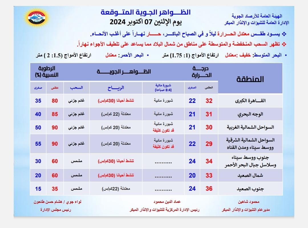 وأضافت أن درجة الحرارة العظمى على القاهرة الكبرى 32 والصغرى 22، وعلى الوجه البحري العظمى 31 والصغرى 21، وشمال الصعيد العظمى 33 والصغرى 20، وجنوب الصعيد العظمى 36 والصغرى 24.