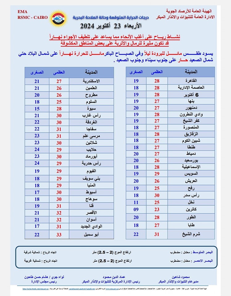 وقالت إن درجة الحرارة العظمى على القاهرة الكبرى 28 والصغرى 19، وعلى الوجه البحري العظمى 27 والصغرى 18، وشمال الصعيد العظمى 29 والصغرى 18، وجنوب الصعيد العظمى 32 والصغرى 21.