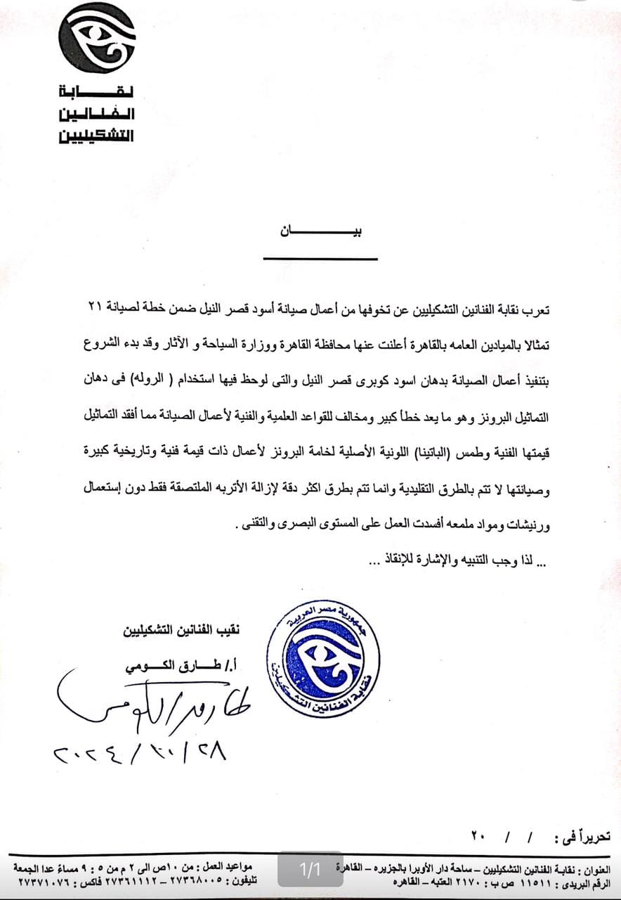 وكانت نقابة التشكيليين أصدرت بيانًا تبدي فيه تحفظها على عملية ترميم أسود قصر النيل، وجاء في نصّه: «تعرب نقابة الفنانين التشكيليين عن تخوفها من أعمال صيانة أسود قصر النيل ضمن خطة لصيانة 21 تمثالًا بالميادين العامة بالقاهرة أعلنت عنها محافظة القاهرة ووزارة السياحة والآثار».