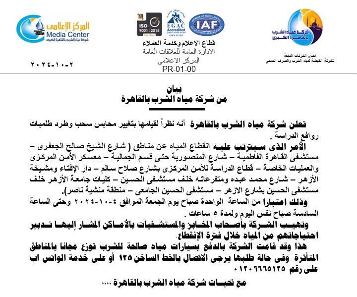 أعلنت شركة مياه الشرب في القاهرة قطع المياه عن عدة مناطق نتيجة إجراء عمليات صيانة، موضحة أن القطع يبدأ صباح الجمعة 4 أكتوبر، وذلك في بيان عبر صفحتها على “فيس بوك”.