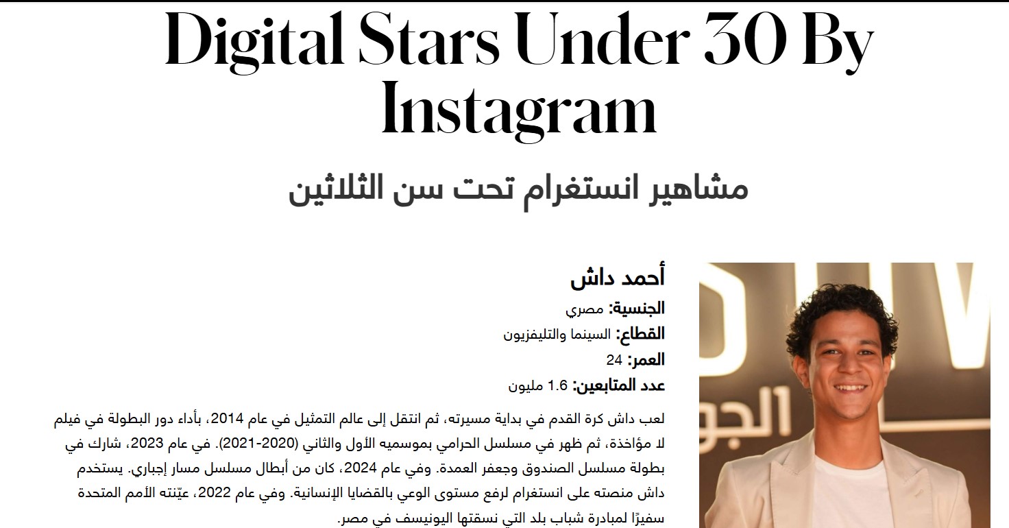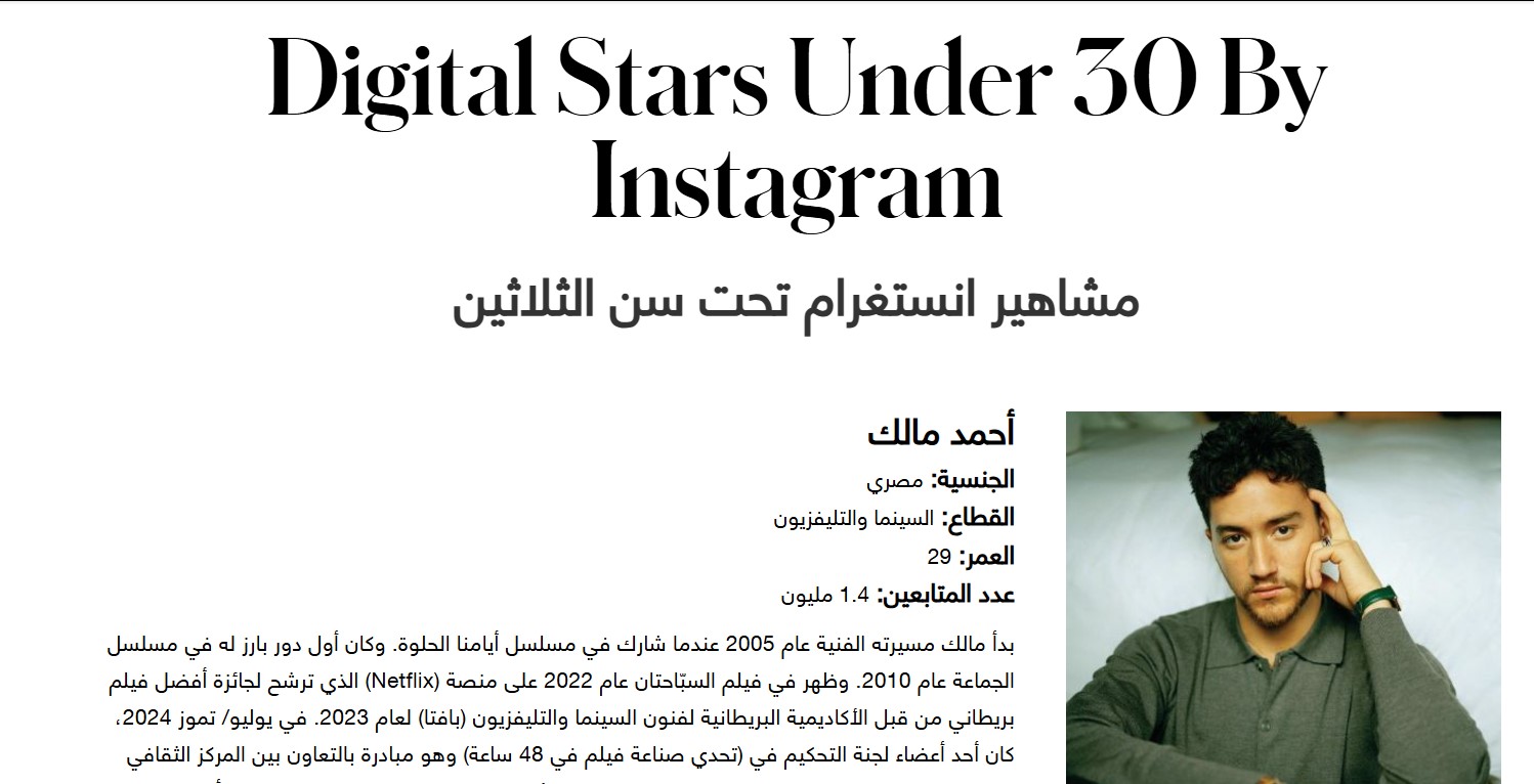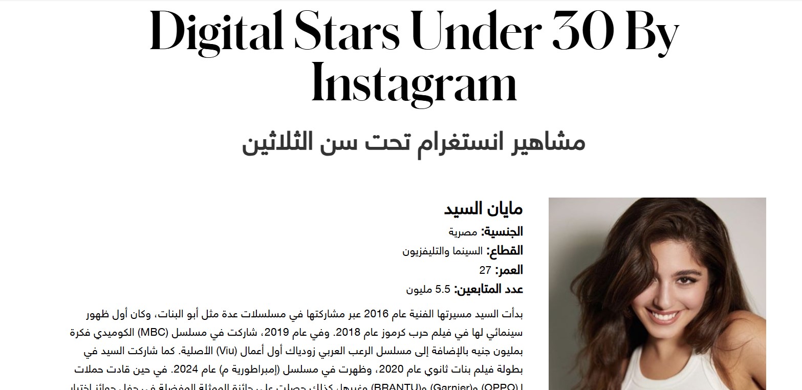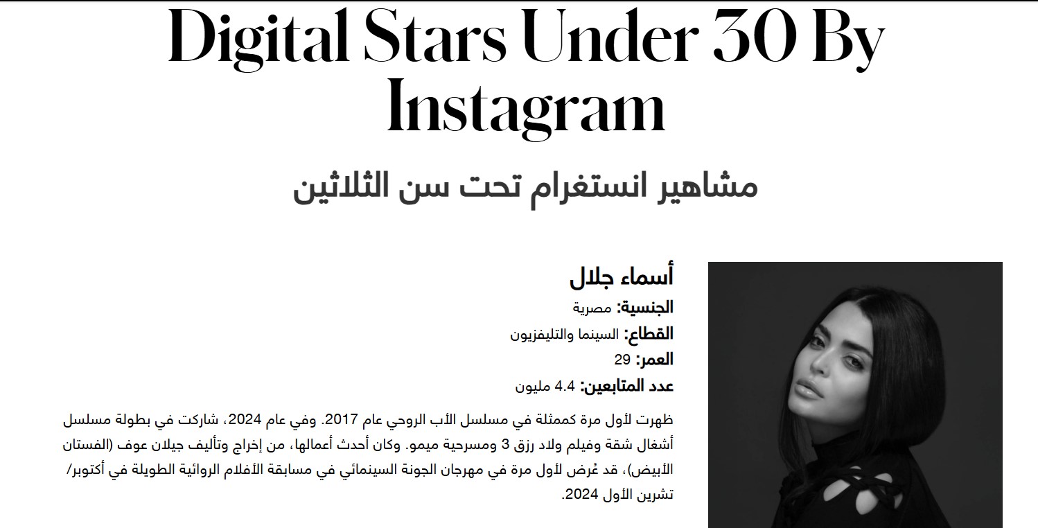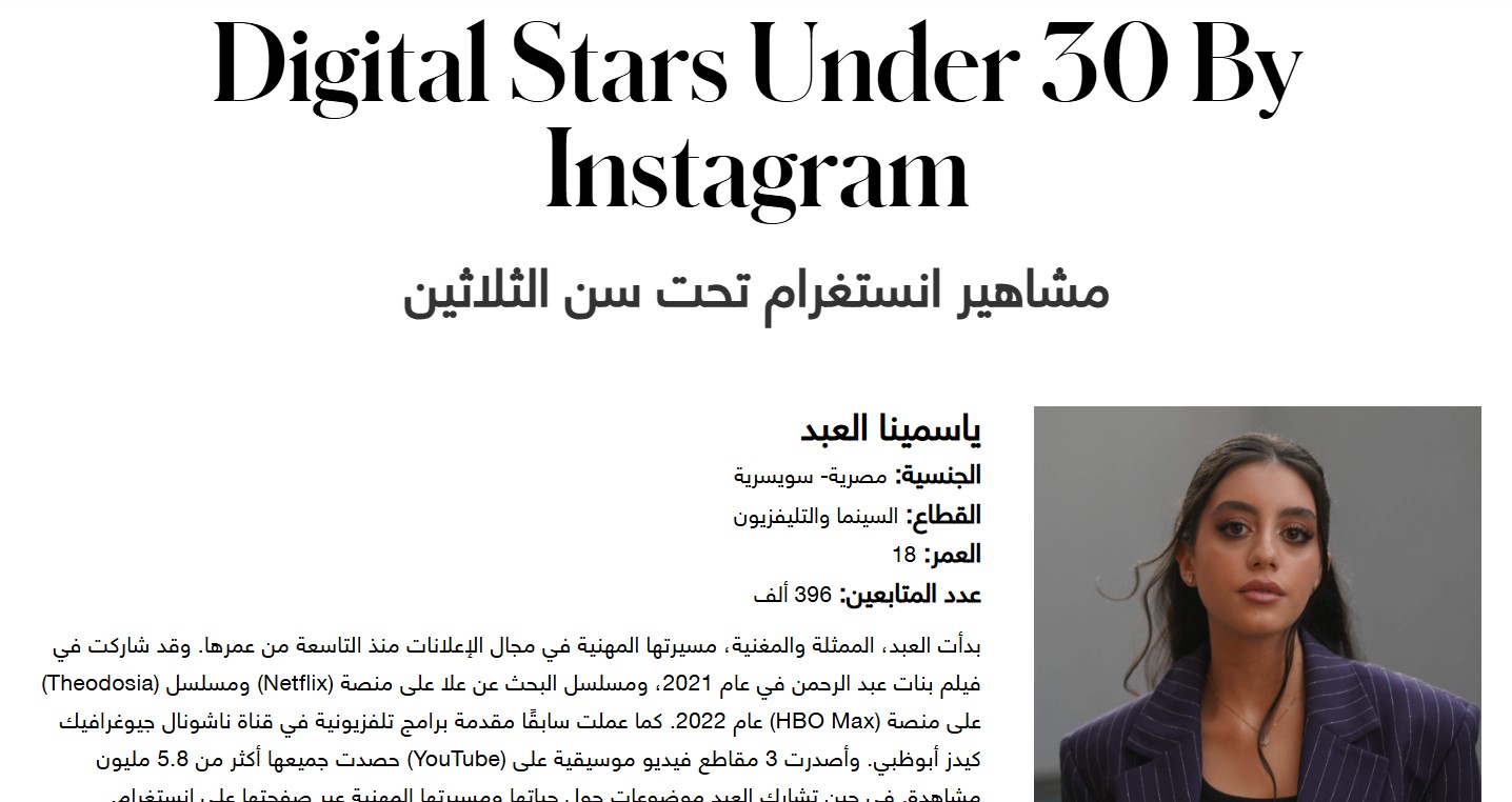 وقالت المجلة، إن فريق البحوث لديها تعاون مع ميتا الشرق الأوسط لإعداد قائمة مشاهير «إنستجرام» تحت سن الـثلاثين التي تضم نخبة من الشباب الموهوبين في مجالات متنوعة، مثل: الموضة والموسيقى والطهي والتلفزيون والسينما، حيث يسهمون في إلهام جيل جديد من المبدعين، ويؤثرون عليه بعمق.