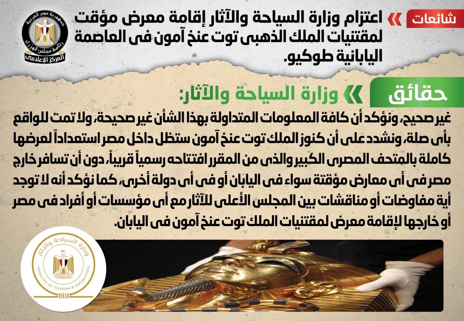 وتواصل المركز الإعلامي لمجلس الوزراء، مع وزارة السياحة والآثار، والتي نفت تلك الأنباء، مؤكدةً أنه لا صحة لاعتزام الوزارة إقامة معرض مؤقت لمقتنيات الملك الذهبي توت عنخ آمون في العاصمة اليابانية طوكيو، وأن كافة المعلومات المتداولة بهذا الشأن غير صحيحة، ولا تمت للواقع بأي صلة.