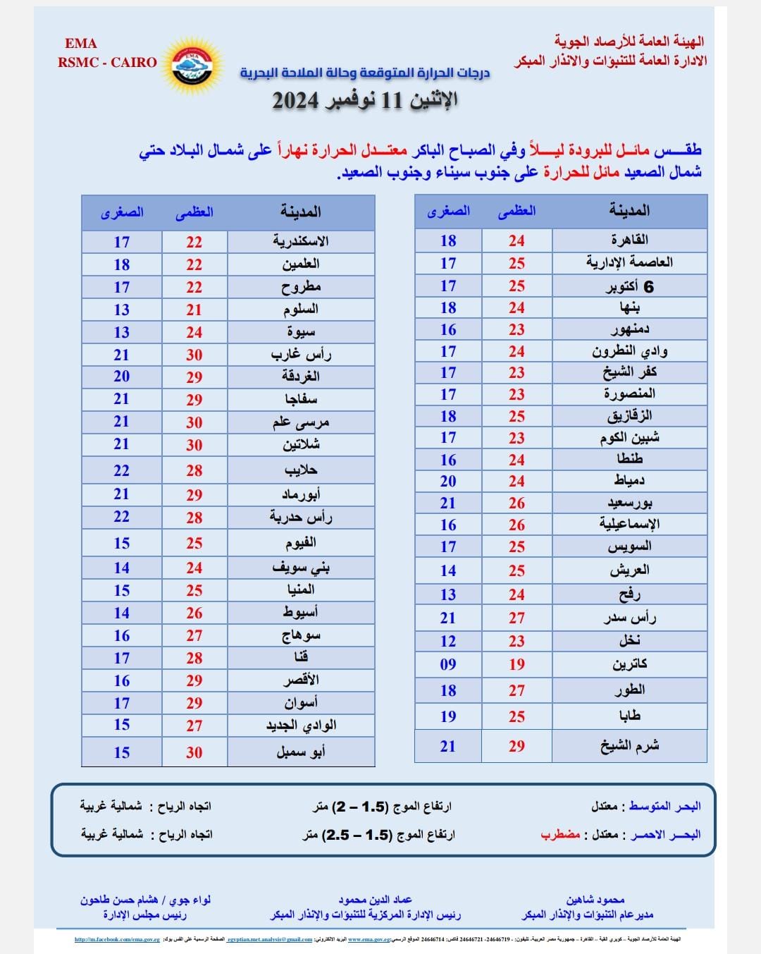 وأضافت الأرصاد أن درجة الحرارة العظمى على القاهرة الكبرى 24 والصغرى 18، وعلى الوجه البحري العظمى 23 والصغرى 17، والسواحل الشمالية العظمى 23 والصغرى 17، وشمال الصعيد العظمى 26 والصغرى 13، وجنوب الصعيد العظمى 28 والصغرى 16.