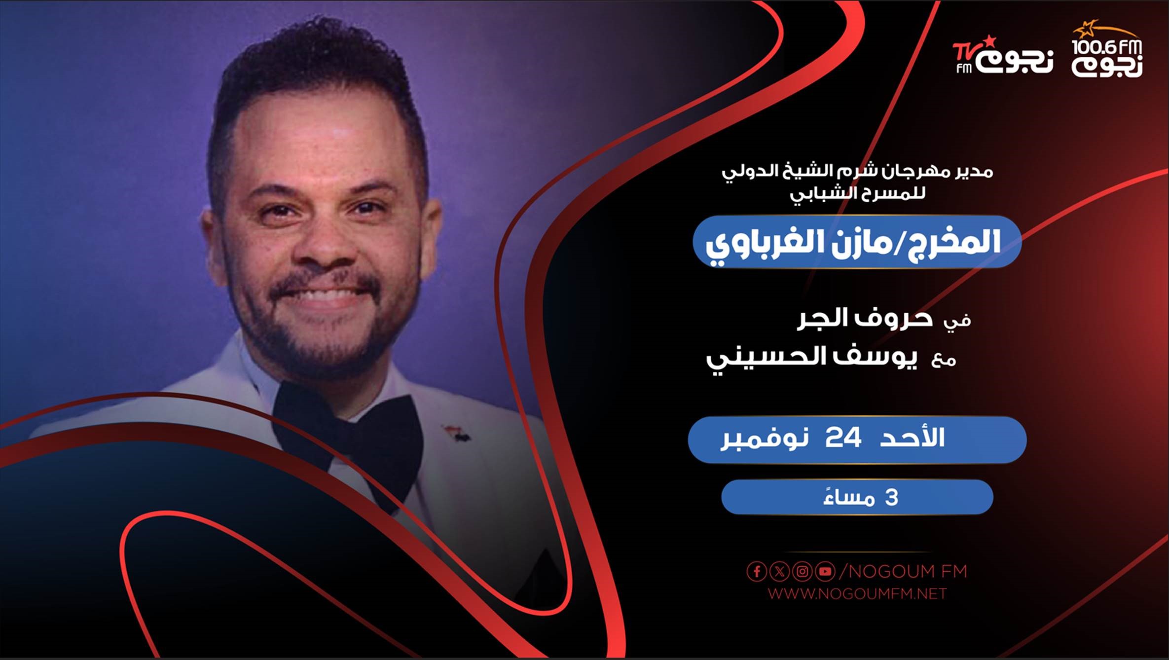 يستضيف الإعلامي يوسف الحسيني، اليوم الأحد 24 نوفمبر، عبر برنامج «حروف الجر» على «نجوم إف إم»، المخرج مازن الغرباوي مدير مهرجان شرم الشيخ الدولي للمسرح الشبابي.