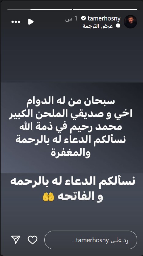 وكتب تامر حسني عبر حسابه الرسمي بموقع «إنستجرام»،: «سبحان من له الدوام، أخي وصديقي الملحن الكبير محمد رحيم في ذمة الله، نسألكم الدعاء له بالرحمة والمغفرة».