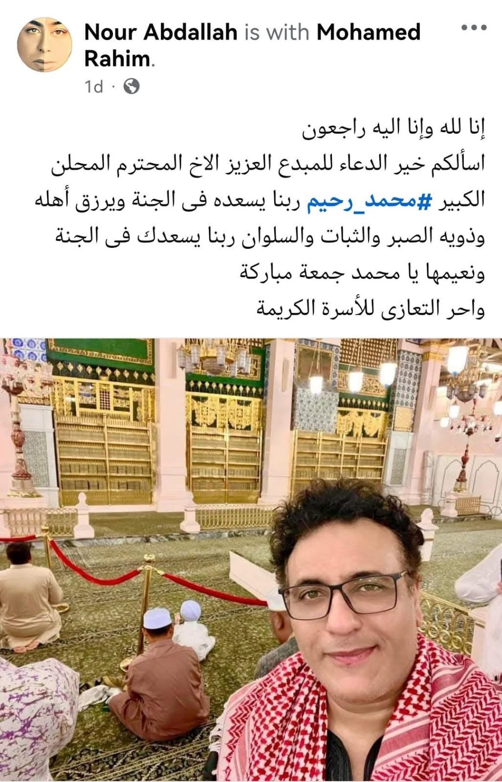 وقامت أنوسة كوتة بتغيير الصورة الشخصية على حسابها «فيسبوك»، بصورة للراحل محمد رحيم داخل المسجد النبوي، وسط مواساة متابعيها.