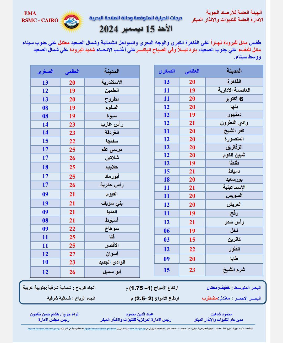 وجاءت درجات الحرارة المتوقعة لليوم الأحد كالتالي: