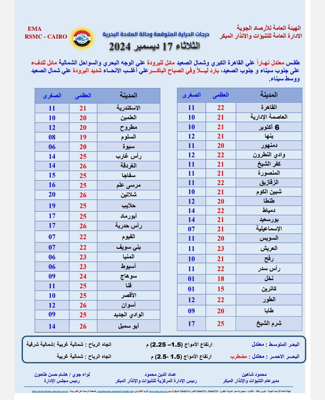 وأشارت هيئة الأرصاد الجوية إلى أن اليوم الثلاثاء يشهد طقس معتدل نهارًا على القاهرة الكبرى وشمال الصعيد مائل للبرودة على الوجه البحري والسواحل الشمالية مائل للدفء على جنوب سيناء وجنوب الصعيد، بارد ليلاً على أغلب الأنحاء شديد البرودة على شمال الصعيد ووسط سيناء.