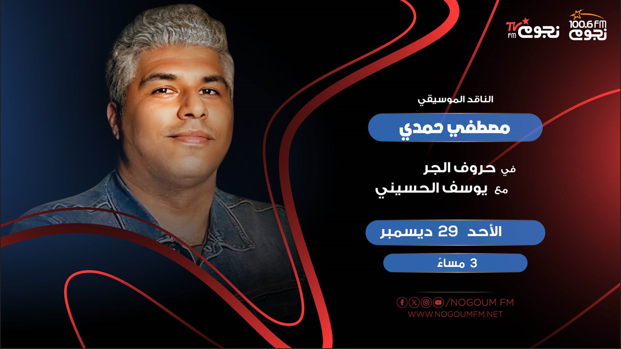 يستضيف الإعلامي يوسف الحسيني، الناقد الموسيقي مصطفى حمدي، اليوم الأحد 29 ديسمبر، عبر برنامج «حروف الجر» على «نجوم إف إم».