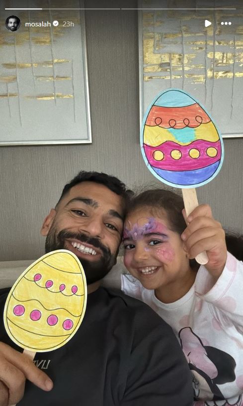 وظهر في الصورة «صلاح» وهو يُمسك برسم بيضة ملونة وكذلك ابنته «كيان» هي الأخرى، في لحظة حميمية لشخصية الأب محمد صلاح.