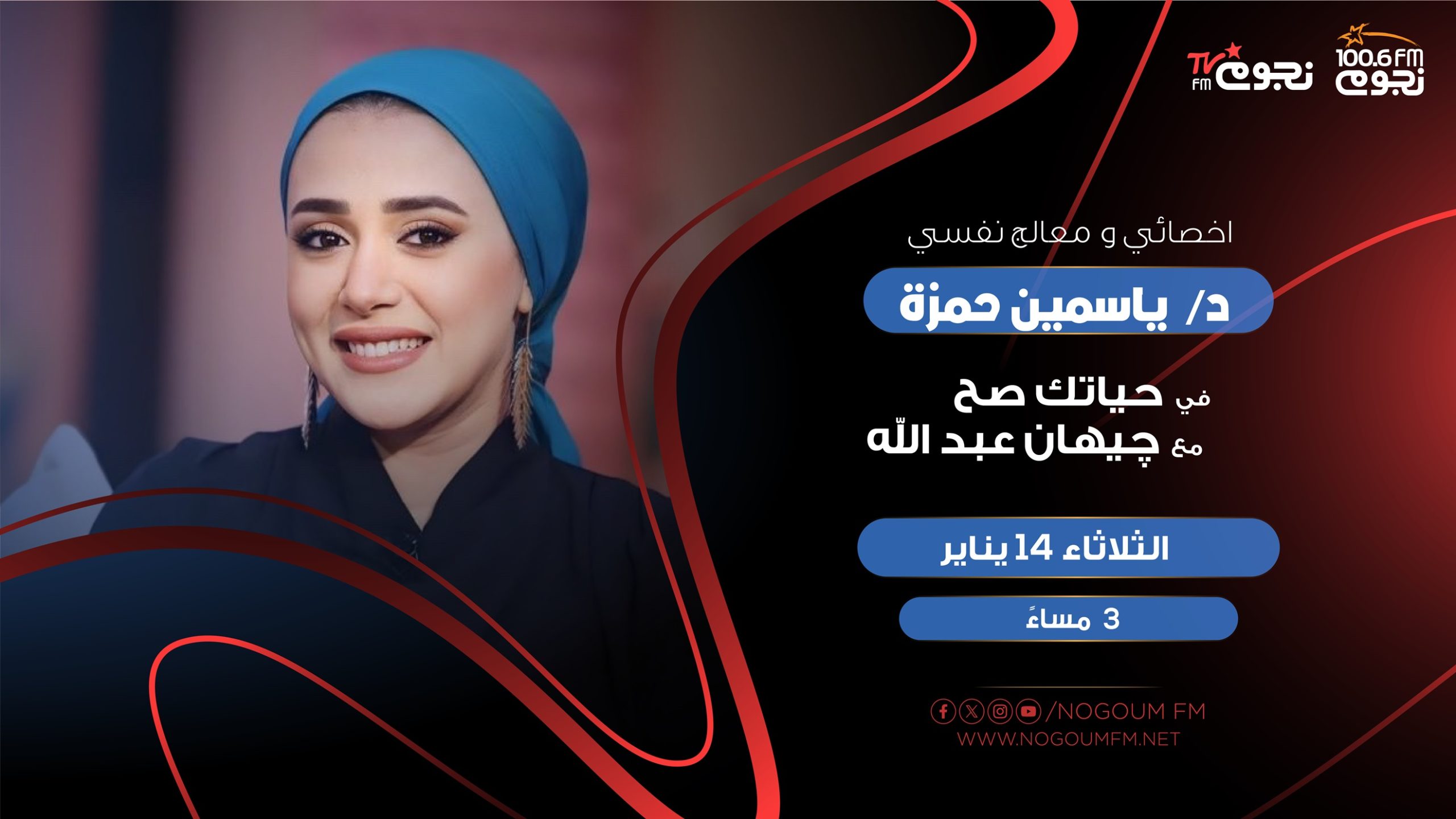 تستضيف جيهان عبد الله عبر برنامج «حياتك صح» على «نجوم إف إم»، يوم الثلاثاء 14 يناير 2025، الدكتورة ياسمين حمزة، الأخصائي والمعالج النفسي.